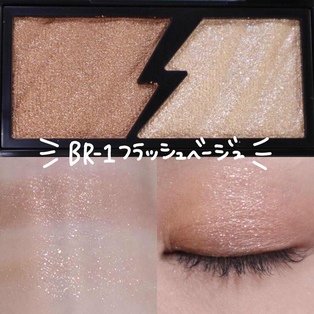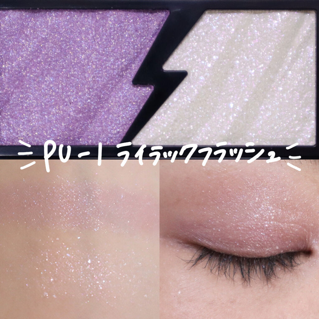 - 質感の違う2つの輝きで火花がクラッシュしたような発光感のある目元印象をつくるアイシャドウ。 まぶたにピタッと密着して、大粒ラメも落ちにくい処方設計。 繊細なカラーパールがきらめくエレクトリカルカラーと存在感のある大粒グリッターでまぶしい輝きを演出するフラッシュグリッターの2つの質感を掛け合わせて、輝き自由自在。 目元以外にも頬や鼻筋のハイライトに使える。