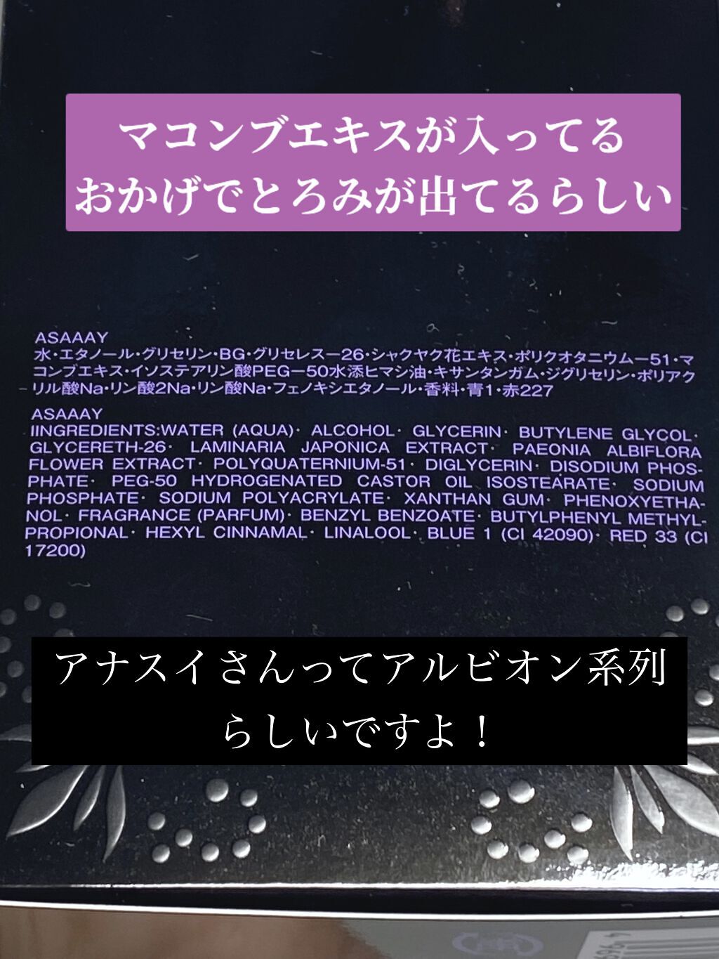 - <150ml> 水、BG、グリセリン、ジグリセリン、キサンタンガム、フェノキシエタノール、香料、エタノール、青1、ポリクオタニウム-51、ポリアクリル酸Na、リン酸2Na、リン酸Na、イソステアリン酸PEG-50水添ヒマシ油、赤227、グリセレス-26、シャクヤク花エキス、マコンブエキス