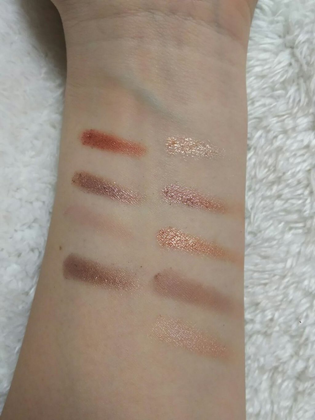 色々なカラーバリエーションがありますが、スタンダードなパレットです。 使いやすい色のセットで、そこまでえげつなく発色するわけではなく、かといって発色しないわけでもないパレットです。 マットの粉はみっしりと詰まっていて、わりとしっかりとした筆じゃないと案外粉が取れないかもしれません。 チップ等が付属していないのはちゃんとした筆を用意してほしいということなのかも……? それはこのキラキラの多色ラメ、粉が緻密で軽すぎて、飛ぶこと…… アイベースを使っていても飛ぶので、結構致命的です。 それでも色はいいし粉もこの値段なら悪くないのでプチプラの中ではおすすめ出来る方です。
