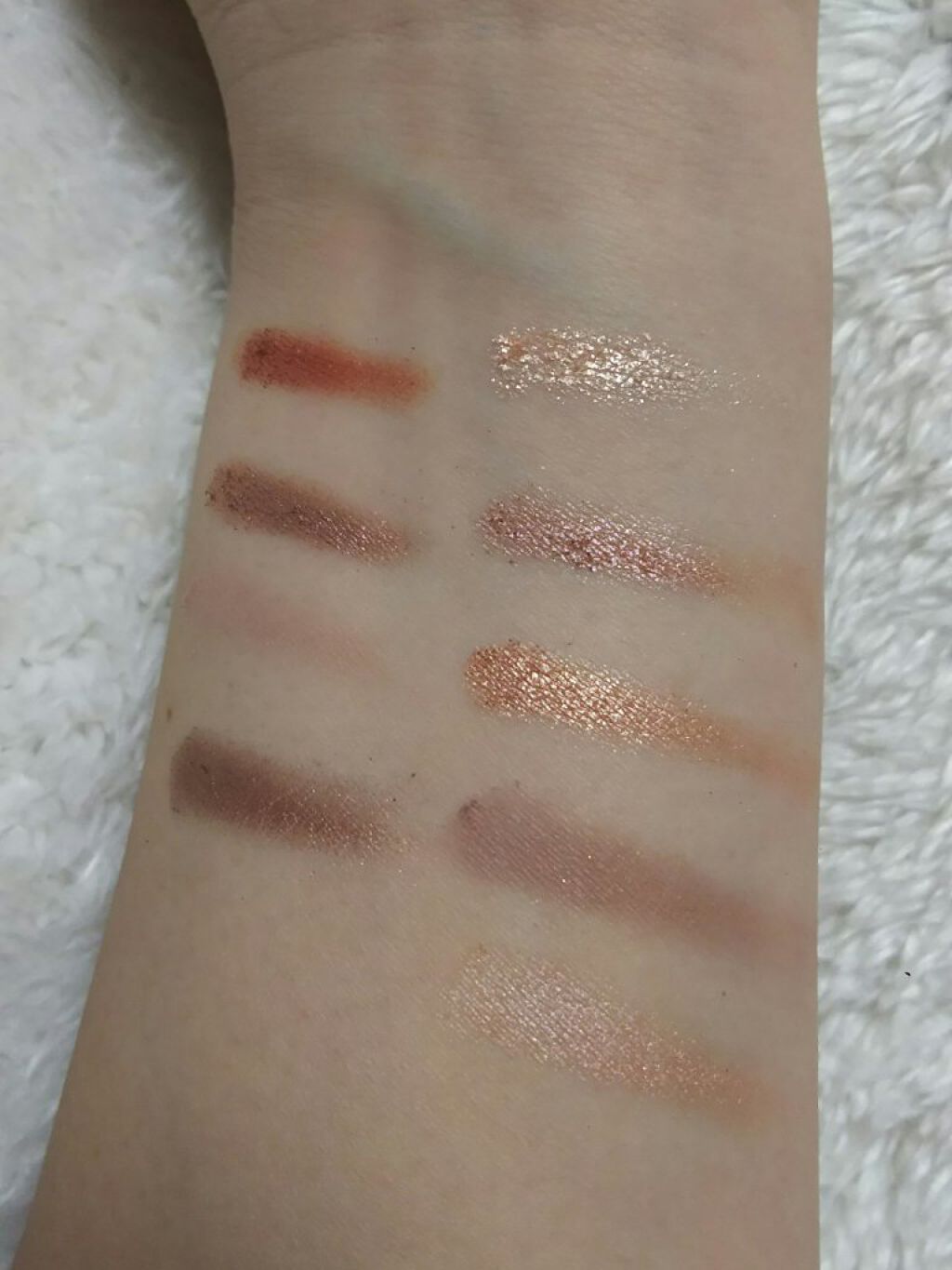 100円とは思えない発色の良さで、ラメが細かいものからグリッターまで色・質感が違うものが入っています イエベ向きの無難なブラウンで使いやすい🙆♀️ 全体的に粉飛び、崩れやすさがあるので、アイシャドウベースを使った方がいいと思います🦖⋆͛