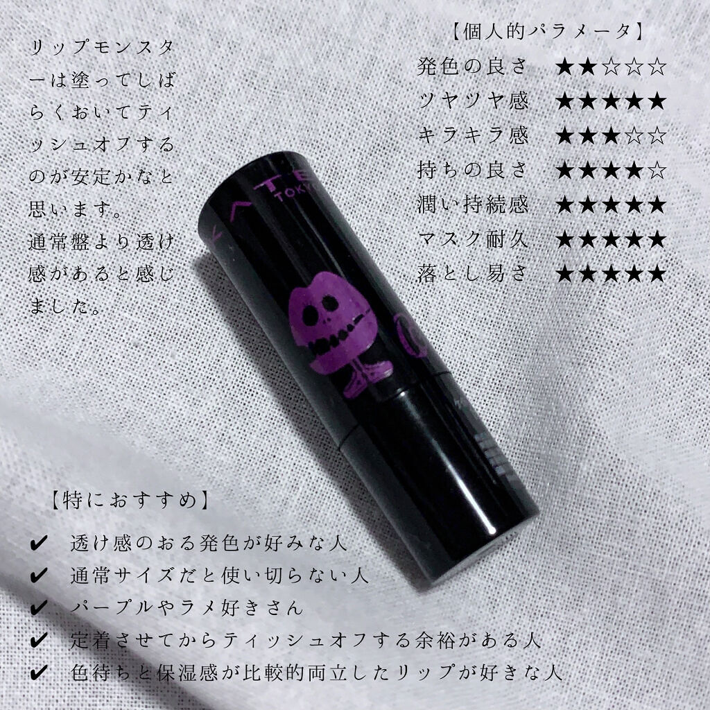 バズってるリップモンスター、やはり良かった。星で表すと発色の良さ★★★☆☆ツヤツヤ感★★★★☆持ちの良さ★★★★★マスク耐久★★★★★潤い持続感★★★★☆オフし易さ★★★★★のように感じました。✓KATEリップモンスター03陽炎(¥1,540...