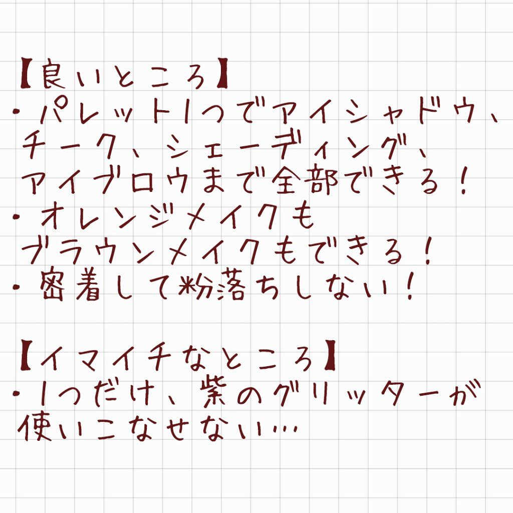・パレット1つでアイシャドウ、チーク、アイブロウ、シェーディング全部できる! ・オレンジメイクもブラウンメイクもできる! ・密着して粉落ちしない! ・色が、可愛いっ!!