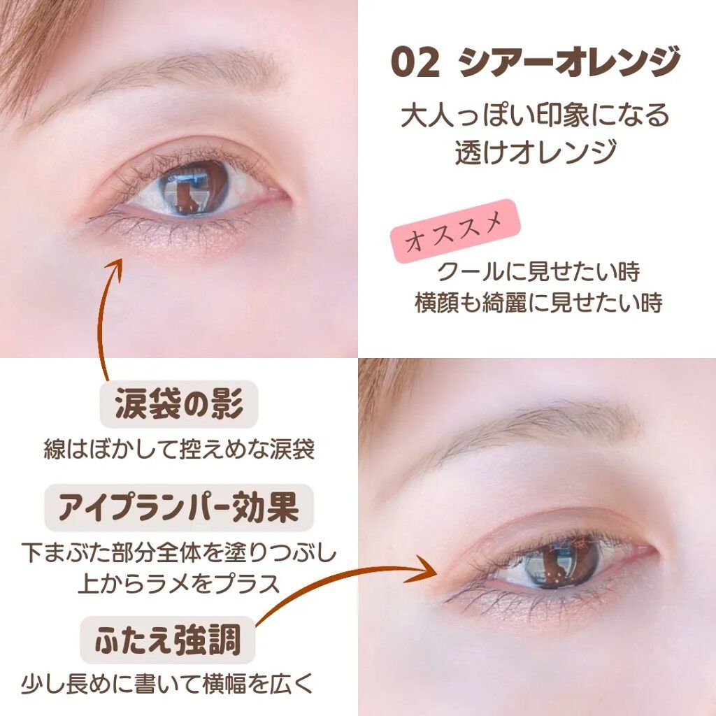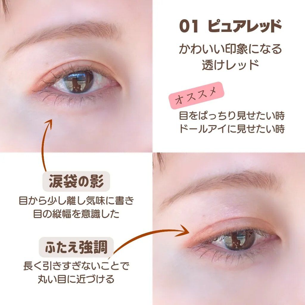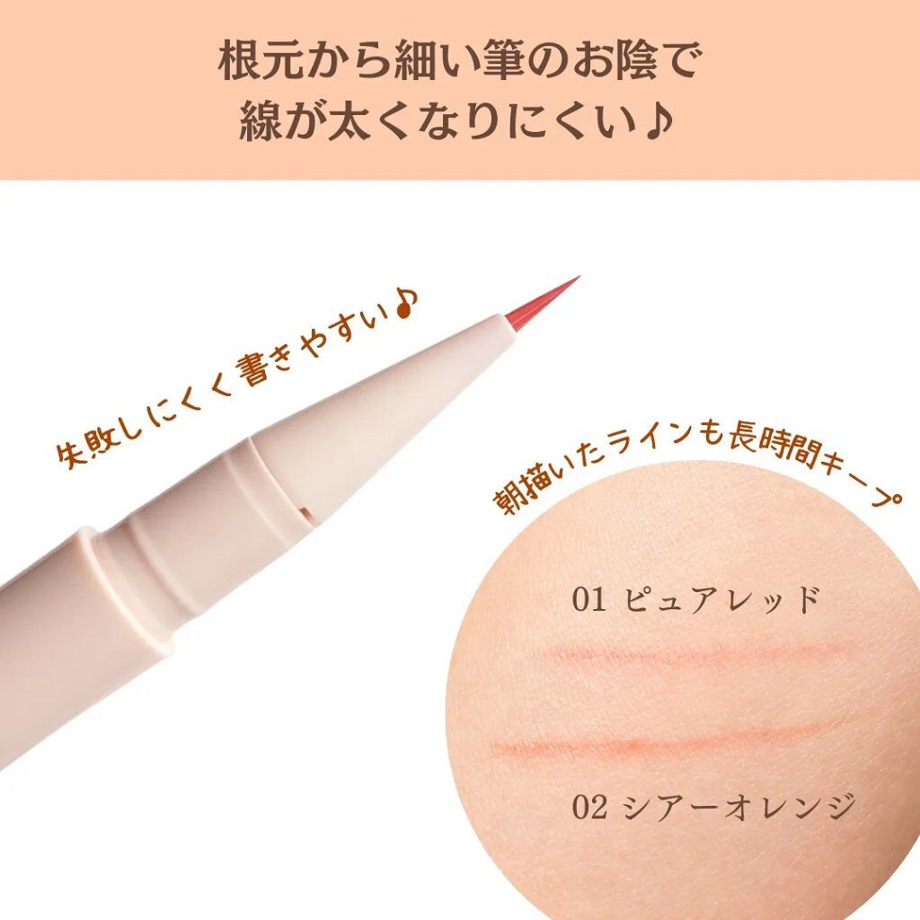 - ふたえ強調・涙袋の影・アイプランパー効果(※)に使える 激細筆の目元用透けルージュライナー 自然でリアルな血色を叶える、絶妙な透け発色ライナー♥ まるで目元にルージュを塗ったかのように血色感を与え、かわいい印象に仕上がります。 描いた線が太くならないよう、筆を根元から細くして 描きやすい距離と適度なコシになるように、短い筆に仕上げました。 汗・皮脂・こすれに強く、朝描いたラインも長時間キープされます。 (※メイクアップ効果による)