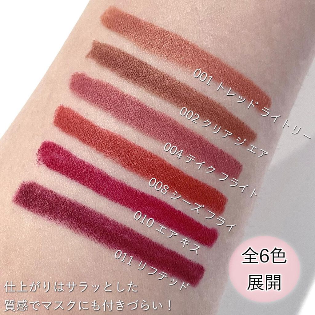 - <001 トレッド ライトリー> イソドデカン、カプリリルメチコン、合成ワックス、リンゴ酸ジイソステアリル、ポリブテン、ベヘン酸セテアリル、シリカ、マンゴー種子油、テトラ(ジ-t-ブチルヒドロキシヒドロケイヒ酸)ペンタエリスリチル、安息香酸ベンジル、香料 [+/-] マイカ、合成フルオロフロゴパイト、硫酸Ba、ロジン、酸化チタン、酸化鉄、マンガンバイオレット、赤201、赤202、黄5、青1 <002 クリア ジ エア> イソドデカン、カプリリルメチコン、合成ワックス、リンゴ酸ジイソステアリル、ポリブテン、ベヘン酸セテアリル、シリカ、マンゴー種子油、テトラ(ジ-t-ブチルヒドロキシヒドロケイヒ酸)ペンタエリスリチル、安息香酸ベンジル、香料 [+/-] マイカ、合成フルオロフロゴパイト、硫酸Ba、ロジン、酸化チタン、酸化鉄、マンガンバイオレット、赤201、赤202、黄5、青1 <003 スフレ オール デイ> イソドデカン、カプリリルメチコン、合成ワックス、リンゴ酸ジイソステアリル、ポリブテン、ベヘン酸セテアリル、シリカ、マンゴー種子油、テトラ(ジ-t-ブチルヒドロキシヒドロケイヒ酸)ペンタエリスリチル、安息香酸ベンジル、香料 [+/-] マイカ、合成フルオロフロゴパイト、硫酸Ba、ロジン、酸化チタン、酸化鉄、マンガンバイオレット、赤201、赤202、黄5、青1 <008 シーズ フライ> イソドデカン、カプリリルメチコン、合成ワックス、リンゴ酸ジイソステアリル、ポリブテン、ベヘン酸セテアリル、シリカ、マンゴー種子油、テトラ(ジ-t-ブチルヒドロキシヒドロケイヒ酸)ペンタエリスリチル、安息香酸ベンジル、香料 [+/-] マイカ、合成フルオロフロゴパイト、硫酸Ba、ロジン、酸化チタン、酸化鉄、マンガンバイオレット、赤201、赤202、黄5、青1 <010 エア キス> イソドデカン、カプリリルメチコン、合成ワックス、リンゴ酸ジイソステアリル、ポリブテン、ベヘン酸セテアリル、シリカ、マンゴー種子油、テトラ(ジ-t-ブチルヒドロキシヒドロケイヒ酸)ペンタエリスリチル、安息香酸ベンジル、香料 [+/-] マイカ、合成フルオロフロゴパイト、硫酸Ba、ロジン、酸化チタン、酸化鉄、マンガンバイオレット、赤201、赤202、黄5、青1 <011 リフテッド> イソドデカン、カプリリルメチコン、合成ワックス、リンゴ酸ジイソステアリル、ポリブテン、ベヘン酸セテアリル、シリカ、マンゴー種子油、テトラ(ジ-t-ブチルヒドロキシヒドロケイヒ酸)ペンタエリスリチル、安息香酸ベンジル、香料 [+/-] マイカ、合成フルオロフロゴパイト、硫酸Ba、ロジン、酸化チタン、酸化鉄、マンガンバイオレット、赤201、赤202、黄5、青1 <004 テイク フライト> イソドデカン、カプリリルメチコン、合成ワックス、リンゴ酸ジイソステアリル、ポリブテン、ベヘン酸セテアリル、シリカ、マンゴー種子油、テトラ(ジ-t-ブチルヒドロキシヒドロケイヒ酸)ペンタエリスリチル、安息香酸ベンジル、香料 [+/-] マイカ、合成フルオロフロゴパイト、硫酸Ba、ロジン、酸化チタン、酸化鉄、マンガンバイオレット、赤201、赤202、黄5、青1