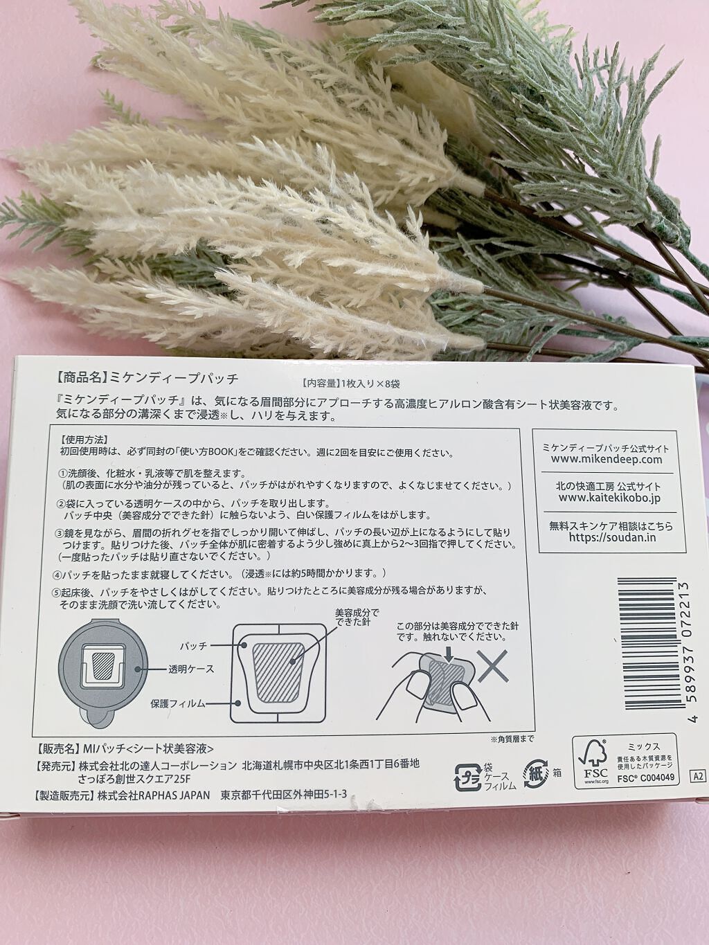 北の快適工房 ミケンディープパッチ眉間に貼るマイクロニードルパッチです。スキンケアの最後におこないます。箱の中には個包装で入ってます。開けると透明なケースに入っており、開けてパッチを取り出します。四隅から剥離紙を剥がし、眉間に貼る。貼る時間は...