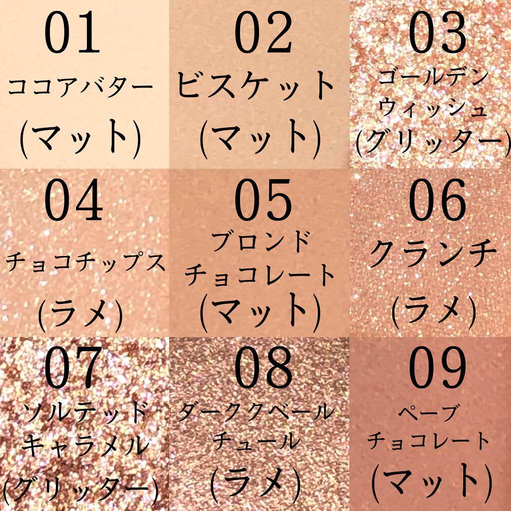 奥ゆかしいチョコレートブラウンムードを詰め込んだアイシャドウパレット🧸 色味はもちろん、アイシャドウが立体的になっていて、本物のチョコレートみたいな、見た目からして可愛い❣️ マットからラメ、グリッターまでバリエーション豊富な9色で、思いのままにアイメイクができる万能パレット🐰