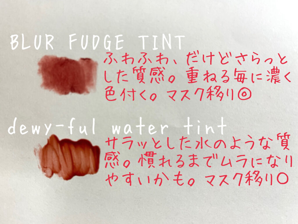 わたし的に唇に塗りやすかったのはデュイフルウォーターティントでした!! つけ心地がいいなと思ったのはジューシーラスティングティントでした!軽すぎず重すぎず、ちょうどいいテクスチャー✨ わたし的にいい香りだなと思ったのはデュイフルウォーターティントでした♡唇に乗せても不快感なく、もはやいい香り☺️ 落ちにくさNo.1はゼロベルベットティントかなと思います🙆♀️✨