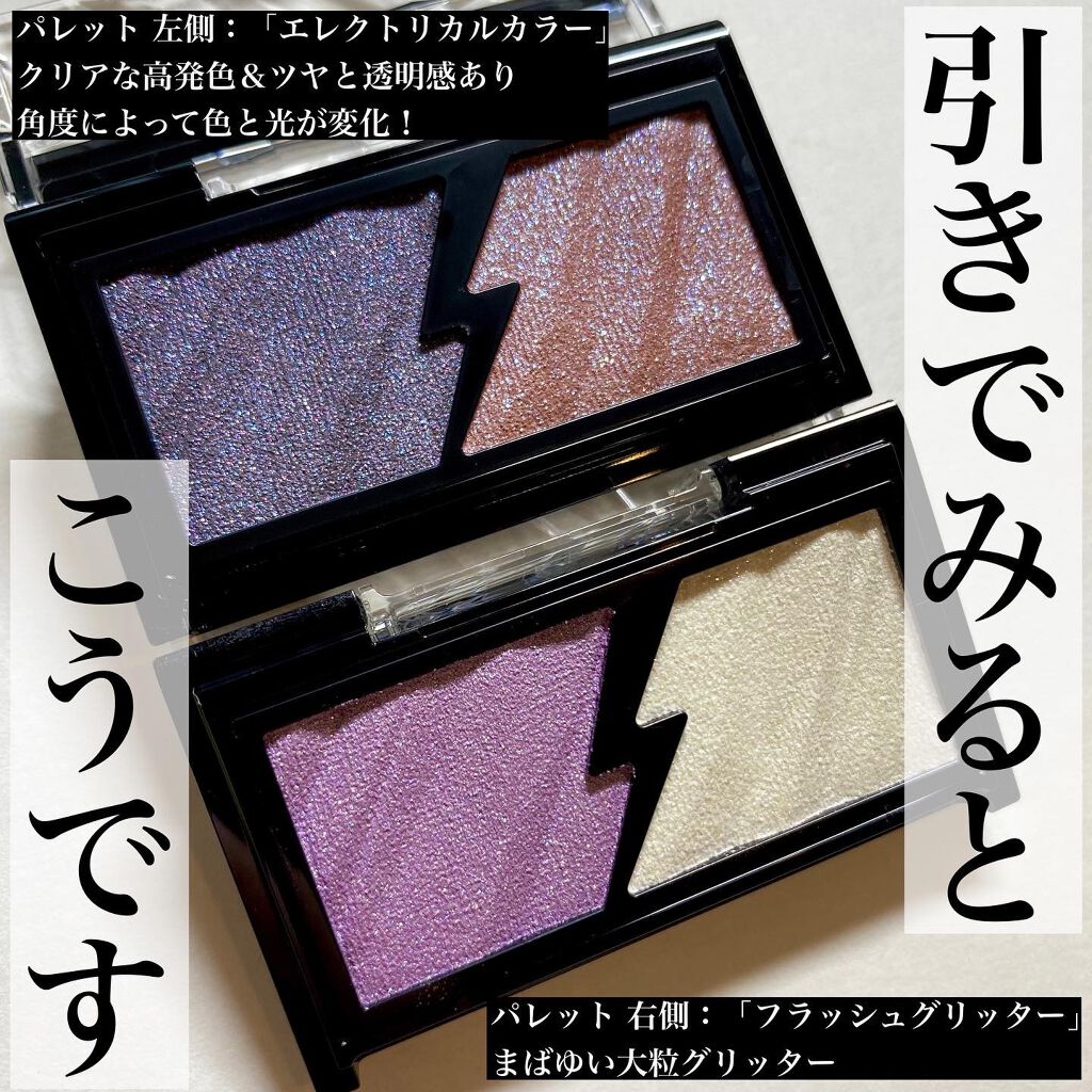- 質感の違う2つの輝きで火花がクラッシュしたような発光感のある目元印象をつくるアイシャドウ。 まぶたにピタッと密着して、大粒ラメも落ちにくい処方設計。 繊細なカラーパールがきらめくエレクトリカルカラーと存在感のある大粒グリッターでまぶしい輝きを演出するフラッシュグリッターの2つの質感を掛け合わせて、輝き自由自在。 目元以外にも頬や鼻筋のハイライトに使える。