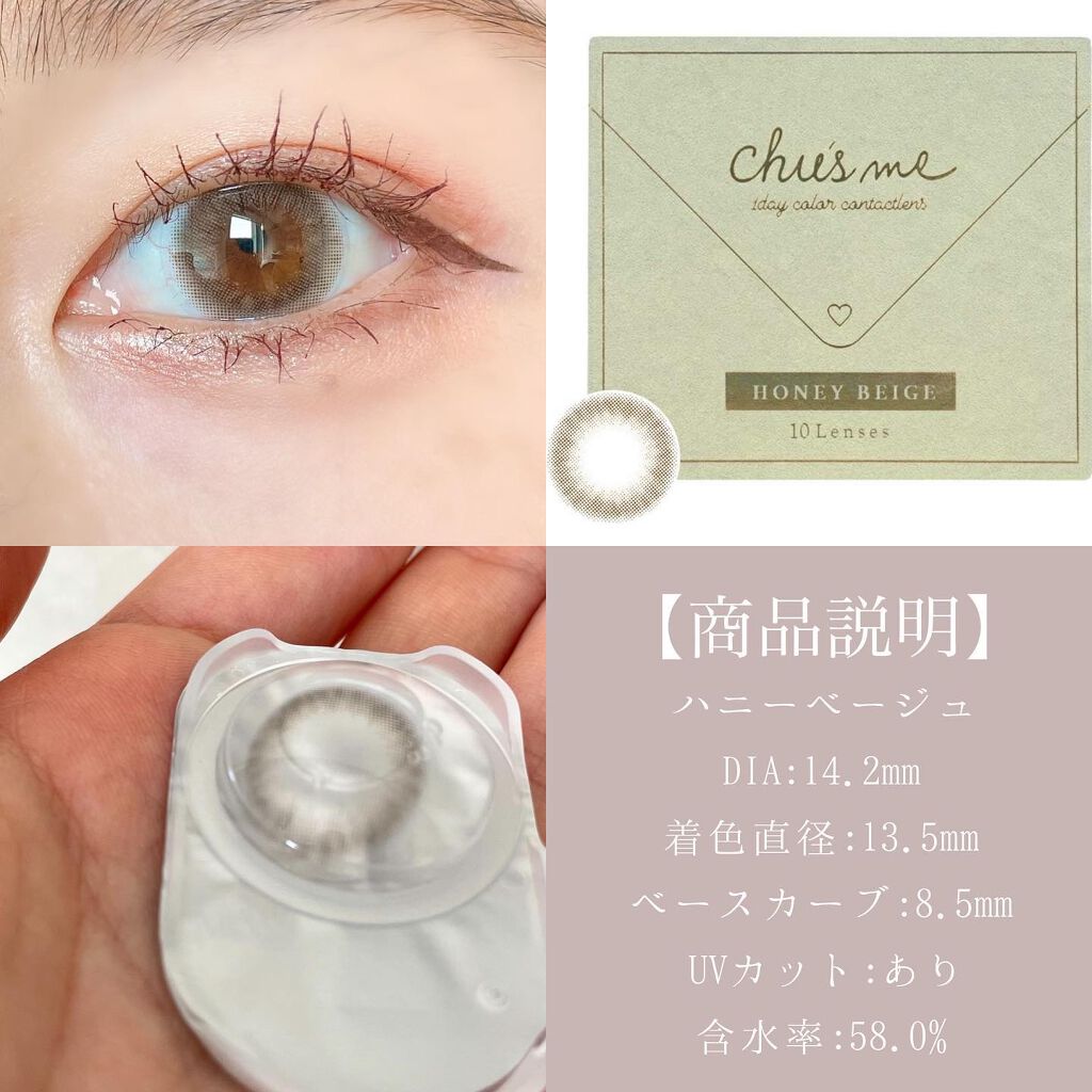 - モテ ①大きすぎず、小さすぎない「モテ比率」 大きすぎて宇宙人…、小さすぎて小粒目… そんなカラコンの悩みに、計算されたサイズ感を実現。 ②男女ウケ◎なカラーバリエーション 男性にも気づかれにくいナチュラルカラーと 女性ウケするニュアンスカラーで、男女ウケ◎! つけごこち ①うるおいたっぷり高含水レンズ 含水率58%のみずみずしい潤いで、装用時の違和感が少なく瞳にフィットします。※個人差があります ②たっぷり酸素を通すレンズ素材 酸素を2倍多く通すレンズ素材で角膜への影響を考慮しました。※同工場の低含水(38%)との比較 ③なめらかエッジデザイン まばたきの時に、瞳とレンズの擦れが少ないなめらかなエッジデザインを採用しました。 ④サンドイッチ製法 色素が直接目に触れないサンドイッチ製法。 カラーコンタクトレンズの不適正使用による眼障害の危険性等などがあります。 ●コンタクトレンズは高度管理医療機器です。不十分な洗浄・消毒など不適切なケアや、長時間・交換期間を超えた装用により、アレルギー性結膜炎、角膜感染症、角膜潰瘍等の重篤な眼障害が発生する危険性があります ●ご使用前に取扱説明書を確認してください 使用上の留意事項 ●眼科医院等を受診してからお求めください ●眼に異常を感じたら直ちにレンズ使用を中止し、お近くの眼科等で診察を受けてください ●医師の指示にしたがってご使用ください ●コンタクトレンズを装用する場合、自覚症状がなくても、眼科医院等での定期検査を受けてください ●レンズに不具合がある場合は使用しないでください