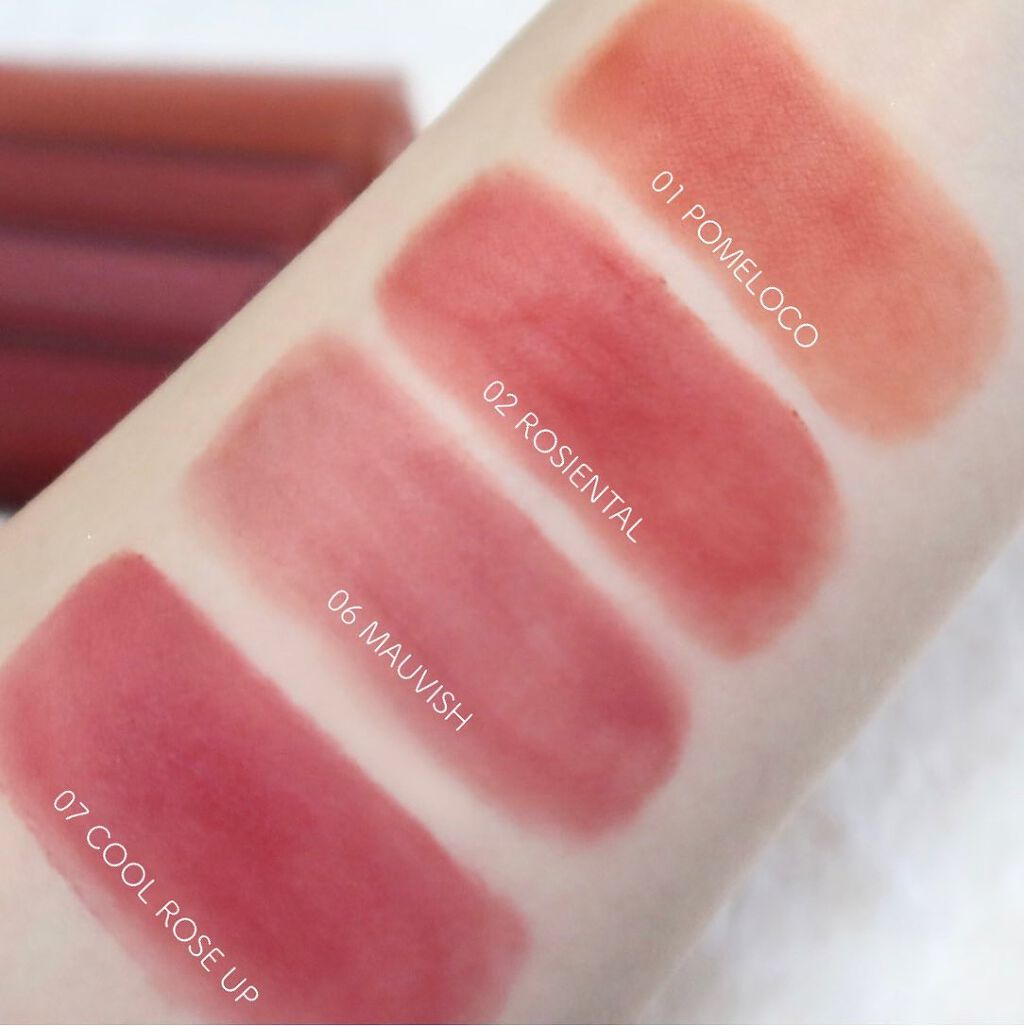 唇にしっかり定着してくれて、ほんと落ちにくい!!😳👏 食事をしても唇に血色感が残るので デートにもおすすめ🥰 しかも全色絶妙にかわいいカラー、、🤤❤️🔥 ブルベ夏のわたしは特に03,04がお気に入り!