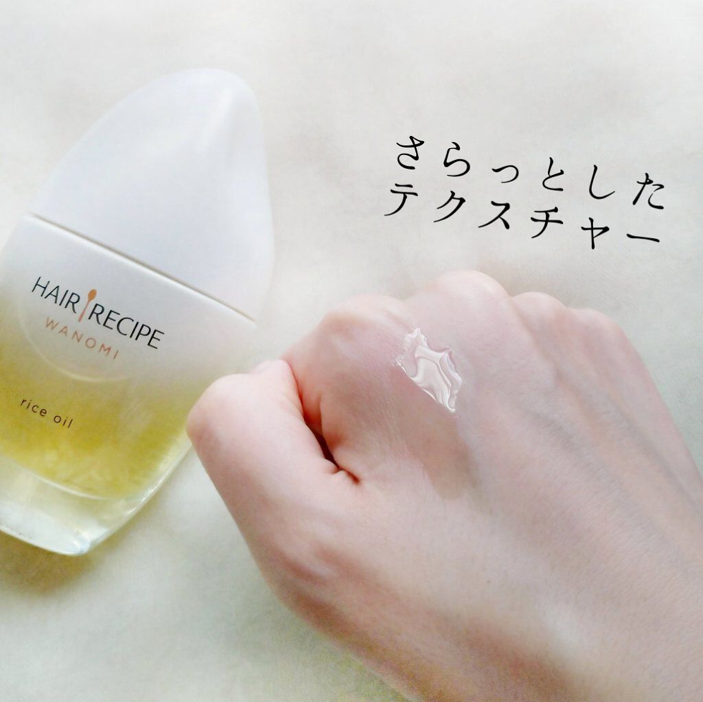 - 国産のピュアな米ぬかオイル*1 が、パサつく髪の内側まで浸透、補修するお米のヘアオイル。 芯からしっとり、なのにべたつかない。 ●古来より伝わる米ぬか美容 古来より、お米には優れた美容効果があることが知られており、肌や髪のうるおいを保つために使われてきました。 「和の実 by ヘアレシピ」はそんなお米のちからに着目。お米由来のヘアケアで、うるおいに満ちた、天使の つや髪へ導きます。 ●1000 粒からたった 1 滴しか採れない貴重な米ぬかオイル*1 米ぬかと米胚芽から抽出される米ぬかオイル*1 は、お米 1000 粒からたった 1 滴しか採れない貴重なオイルです。 独自に開発された精製方法により、日本国内で丁寧に抽出された米ぬかオイル*1 には髪に必要な成分が ぎゅっと濃縮されており、その 1 滴 1 滴が、髪本来の美しさを引き出します。 ●高い浸透力で髪の内側と外側からダブルでアプローチ 日本人の髪はキューティクルが厚くて硬いため、有用成分が浸透しにくいと言われています。そんな日本人の 髪にぴったりなのが米ぬかオイル*1 です。浸透力が非常に高い米ぬかオイル*1は、厚くて硬いと言われる日本人 の髪のキューティクルにも、内側までしっかり浸透します。さらに、外的ストレスからも髪を守って、内と外の両方から アプローチすることで、自然に輝くような、美しい髪を叶えます。 *1 コメヌカ油(浸透性ツヤ成分) ※2022年リニューアル発売