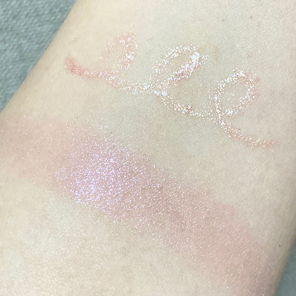 淡いピンクのカラーもさることながら 多色ラメ(ピンクラメが多めかな🤔?)の 煌めきが綺麗〜✨ 02 Innocent Auraのアクアジェムは 淡いピンクカラーなので、 うすーく伸ばしてハイライトっぽくも使えるかなと目論見中です🤣笑 アイシャドウとしての使用は抜群に可愛いです🥰