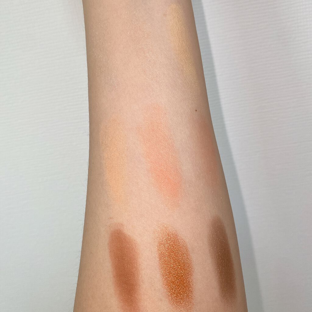 マットだけどどこかツヤ感もあるような柔らかい粉質……なのに粉飛びも少なめなので 瞼に乗せやすい🥰 5番のラメ感は控えめ。 シャンパンカラーに多色ラメがチラッ|˙꒳˙)✨ 実はこの番号通りにカラーを使うとプロ並みのメイクが完成するらしいです……‼️ ケースも薄くてコンパクトなのにベースカラー、ラメ、締め色、チークまで付いてるので 持ち運びやいつか行けるようになるであろう旅行などにも良さそうです❣️
