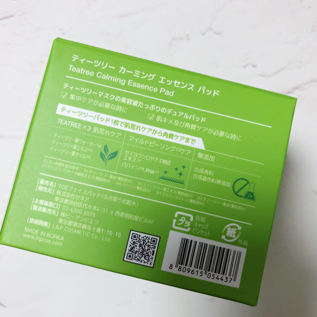 - 肌荒れを予防するティーツリーエッセンス(ティーツリー葉水、ティーツリー葉エキス、ティーツリー葉油の3種類を整肌成分として)を、コットン100%の肌に優しい使い心地のパッドに贅沢にたっぷり配合しております。 片面はエンボスコットン、もう片面がソフトコットンになった「デュアルパッド」になっており、用途に応じての使い分けが可能です。エンボスコットンの面は、手軽に角質・毛穴汚れをオフできる拭き取り化粧水としてお使いいただけます。ソフトコットンの面は、乾燥が気になる部分、肌荒れ予防や集中ケアしたい部分のポイントパックとしてお使いいただけます。 ※2022年9月以降パッケージリニューアル。