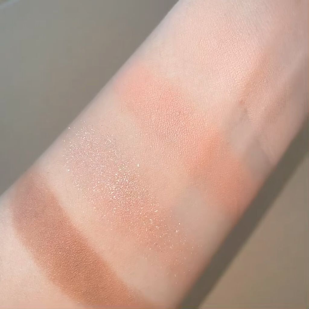 全体的に淡めです! イエベ向きな黄色みのあるブラウン系🤎 シマーなラメが可愛すぎる!! 密着度の高いラメでポンと乗せるだけで キラッキラ✨✨ 粉飛びもしないです! 発色はいいですが淡いので 初心者さんでも使いやすい!!!
