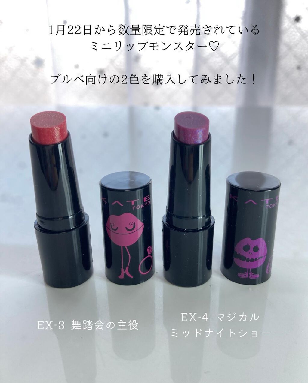 発売前からSNSで話題になっていた新作のリップモンスター👾💄 今回は3色カラーが出ていました👏 EX-3は生焼けパンケーキの名前通り肌馴染みの良いベージュカラー🥞 イエベさん向きカラーです😆 EX-4は青みピンクな感じですがイエベさんブルベさん両方使えそうな可愛らしいピンク🩷