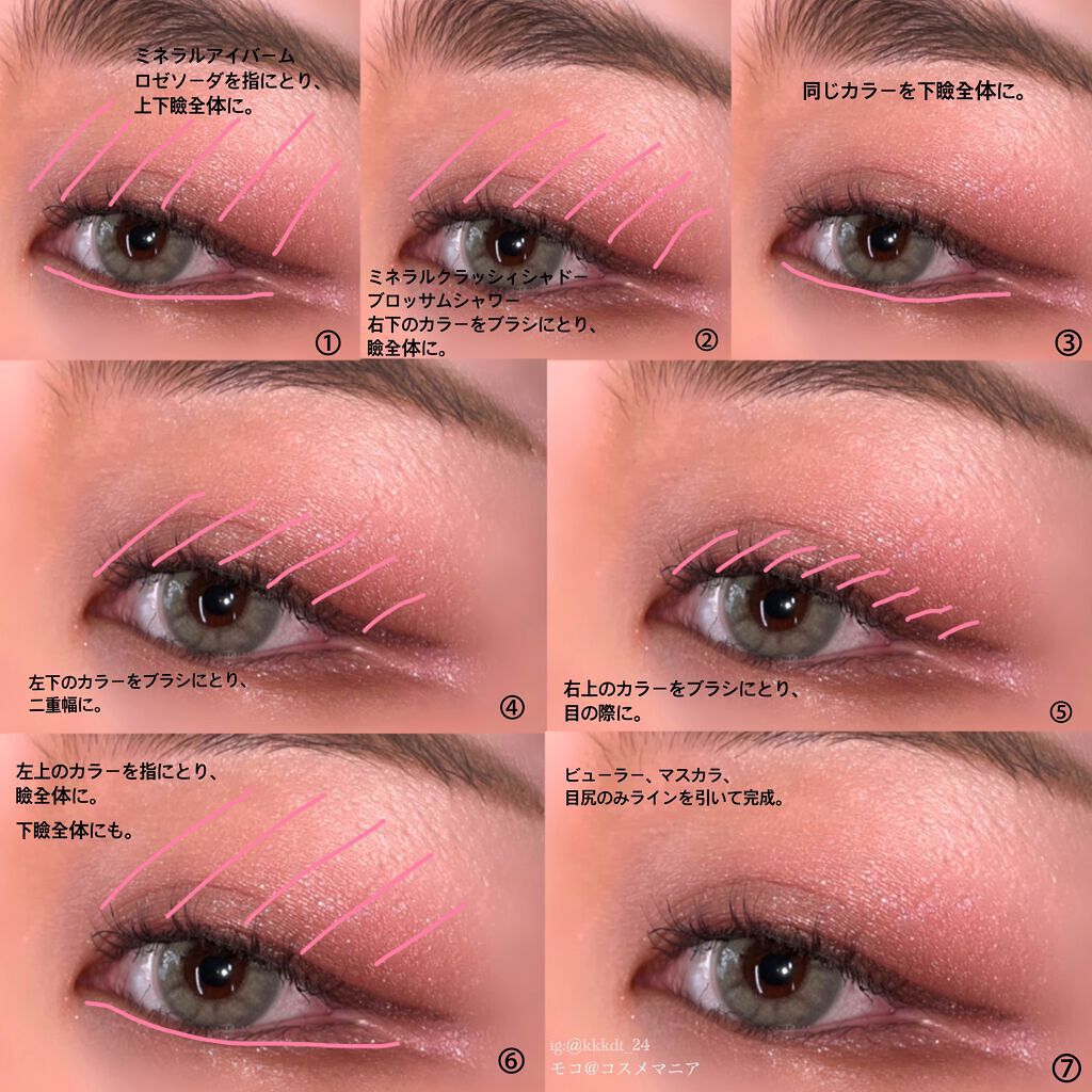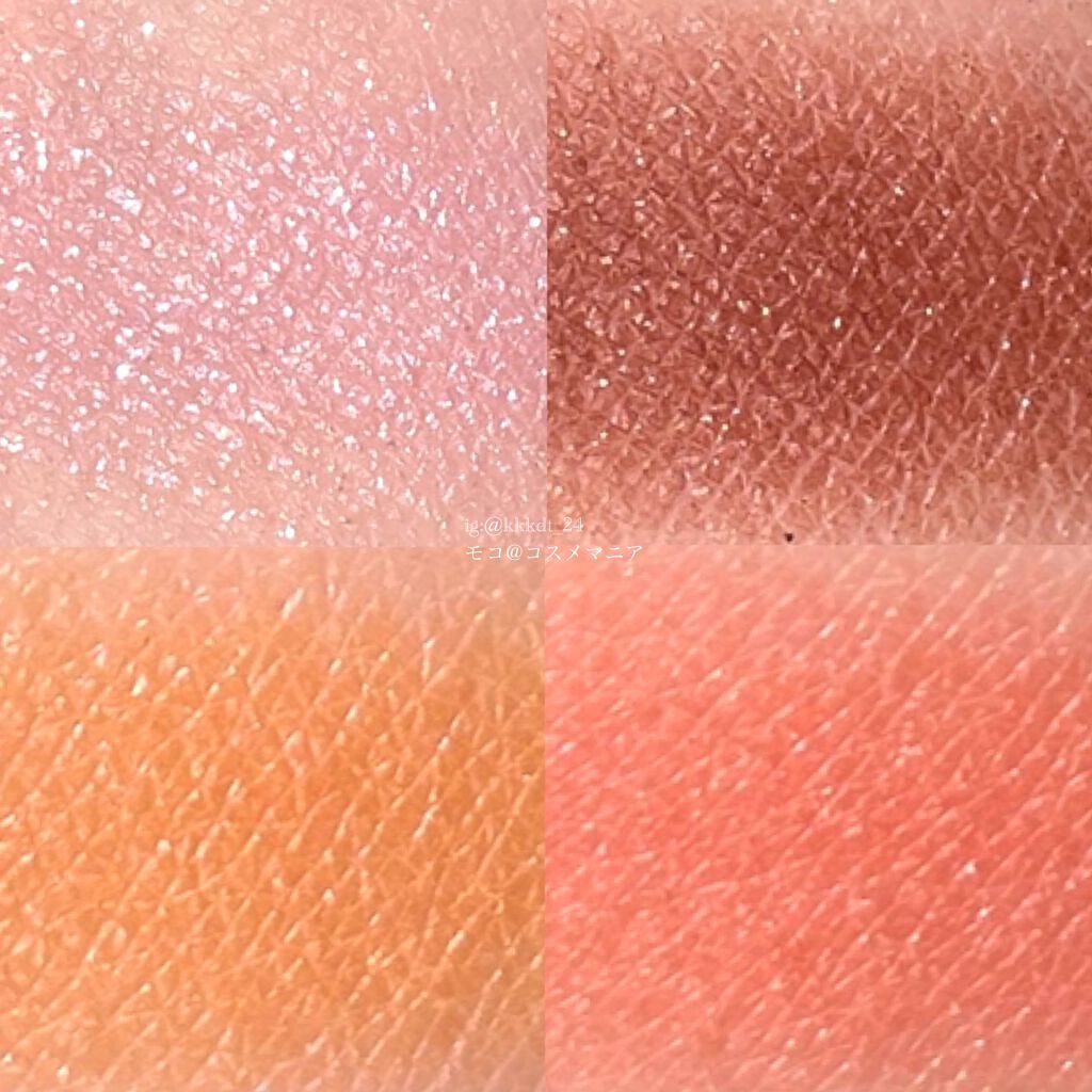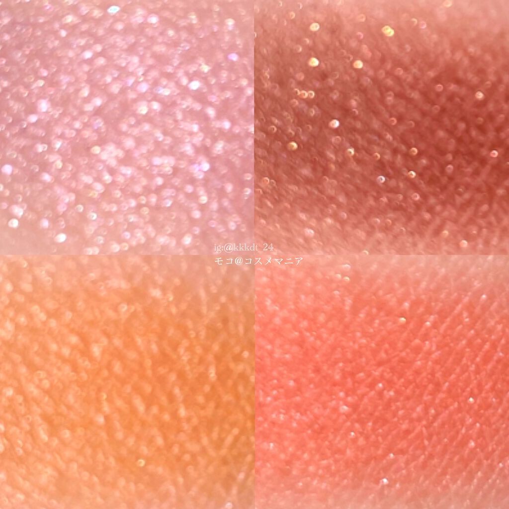 ウォームカラーのオレンジにラベンダーの組み合わせは可愛さが倍増する! 左下、ベースのピンクが実はめちゃ可愛くていい仕事する バームのキラキラも素敵でアイパレの下地に使いました
