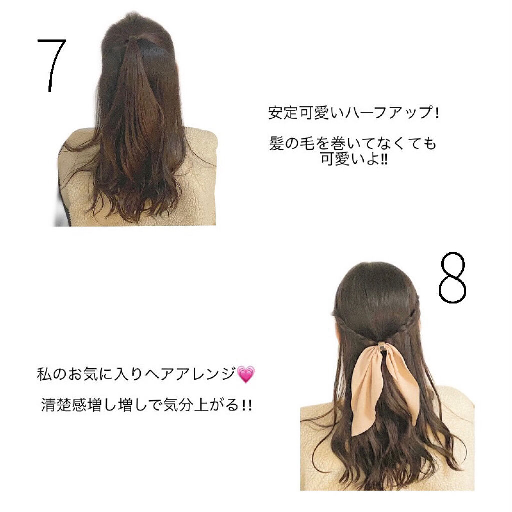 私は髪の毛を巻いて という時によくこのアレンジをします! 髪の毛を上下に分けて下の部分を内巻き、 上の部分を外巻きにします! 頭のてっぺんと耳の上の間から髪の毛を取る この時私は顔周りの髪の毛は取りません! 小さいゴムで結んでヘアアクセサリーをつける ゴムが目立たないように小さいゴムで結びます! 結ぶ時は少し下の方で結びます この3つのステップで簡単可愛いふわふわハーフアップの完成です💖💖