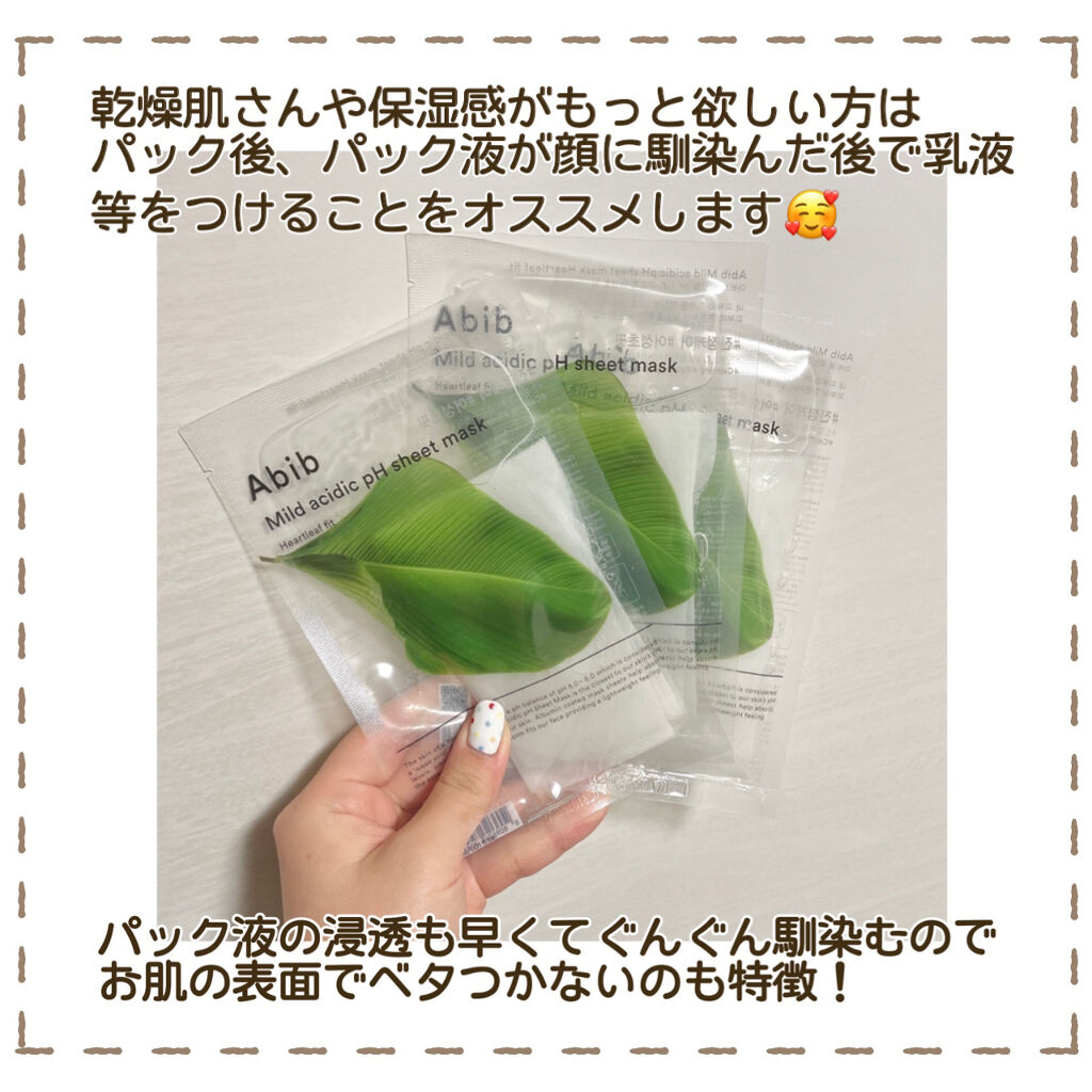Abib弱酸性pHシートマスクドクダミフィットこのパック久しぶりに使用しましたが個人的に一番好きなパックかもです!シートはかなり厚みがあってしっかりしてます!液はひったひたで長時間つけてても乾燥しにくい分厚いシートなのに肌に密着してはがれにく...