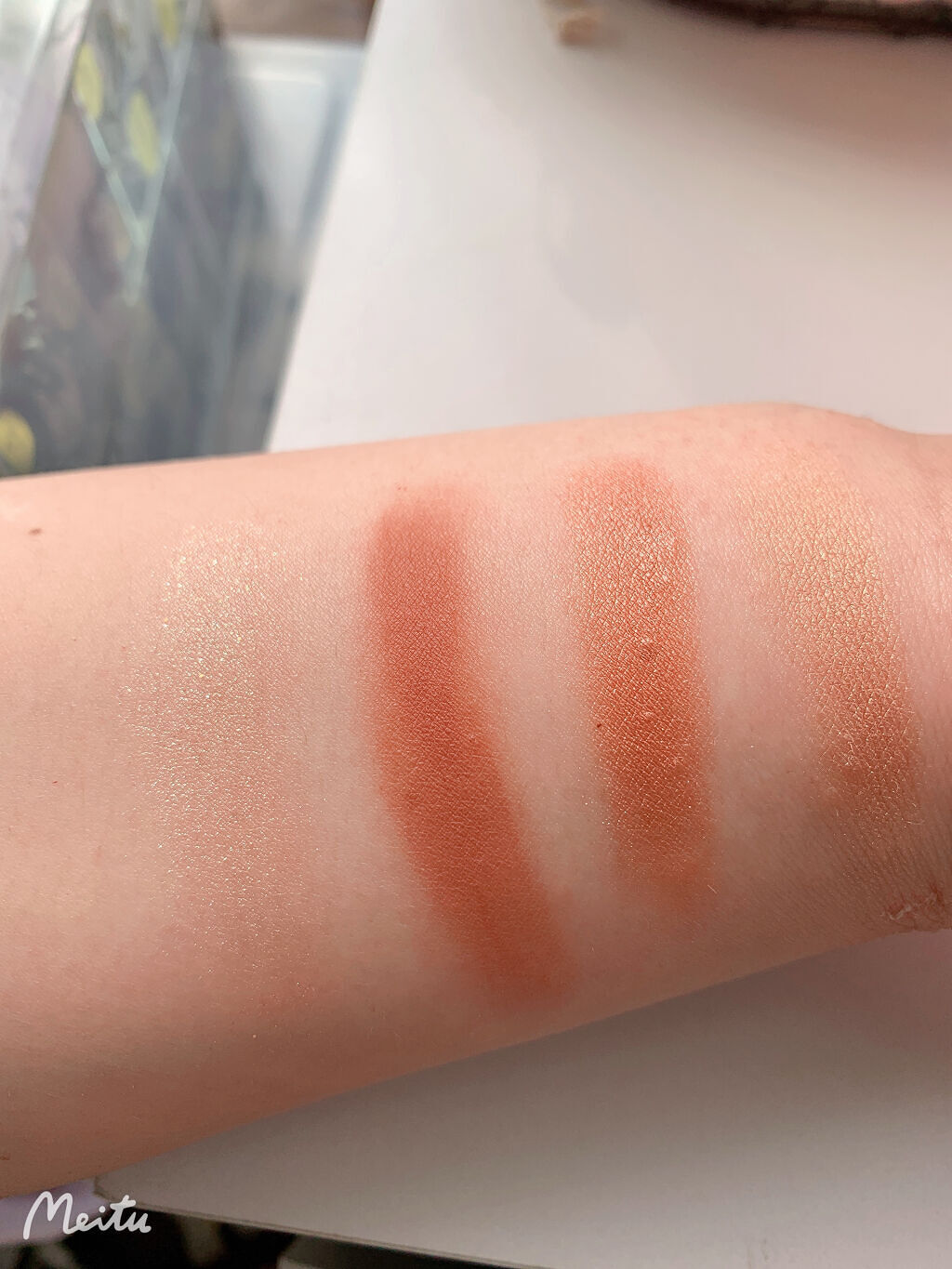 粉質も良く、しっとりしていて、粉飛びも気にならなかったです。 上段の左がオレンジマットで、猫ちゃんの絵が彫られててかわいいです。オレンジがビダミンカラーでかわいい😍 上段の右がラメになっています。しっとりしていて良かったです。仕事にしていくのは、難しいですが、オフの日に付けて、テンションが上がっていいです☺️ 下段の左はピンクのマットにラメがチラチラ入っています。 下段の右は赤にピンクぽさがある、マットにラメがチラチラ入ってます。下段は多色ラメでかわいいです。 上段はイエベさんに合いそう、下段はブルベさんに合いそう、 イエベさんは上段を主に使いながら、ポイントや上段と下段を混ぜたり使い方がたくさんあるパレットだと思います。 ブルベさんは下段を主に使って、上段をポイントに使う感じがいいと思います。 メイクが楽しくなる、かわいいアイシャドウだなと思いました。 イエベさんにも、ブルベさんにもオススメです。