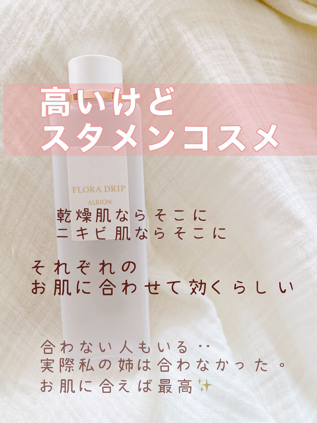 元々リニューアル前から10本以上はリピする程に大好きなフローラドリップ 🤍🤍 使用感はリニューアル後もあまり変わりなく、とろシャバ系のテクスチャーでお肌にぐんぐん入っていく◎ 肌荒れ防止成分がプラスされたみたい🤩 2週間くらい前から花粉なのかお肌のかゆかゆがはじまったのだけど、フローラ使い始めたら落ち着いてきました。 リニューアルと同時に限定キットが出ていて フローラドリップ現品に➕されて、ディスペンサー、スーパーUVカットインテンスコンセントレート10g、セルフホワイトニングミッション10mlも付いてくるから、お得な時期に買うのがオススメ✨✨