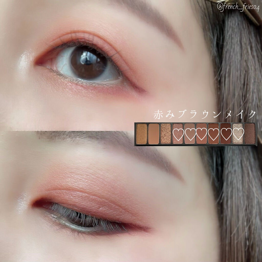 - 肌なじみの良い、鮮やかな発色で目元を華やかに彩る捨て色なしの10色アイシャドウパレット 異なる3種のテクスチャーを自由に組み合わせて、グラデーションも思いのままに。 NEW 2023.4 ・肌トーンにあう配色を詰め込んだトレンドカラー 肌トーンに合わせて、自分に似合うトレンドカラーが楽しめる♡ パーソナルカラー×トレンドカラーの掛け合わせパレットで、デイリーメイクもスペシャルメイクも気分にあわせてなりたい自分に! ・むにゅっとジェル質感ラメで高密着、煌めく目元 パレットの中でもポイントとなる大きめ粒子のラメは、ジェルのような新質感で落ちにくく肌にぴったりと密着します。キラキラとした目元をキープします。 ・使うカラーは大きめに!リアル捨て色なしパレット ベースやラメのよく使うカラーと締め色や濃い色等の減りが少ないカラーを異なるサイズで詰め込んだ、リアル捨て色なしパレット! <使用方法> 付属のデュアルシャドウブラシでベースカラーをまぶた全体に塗り広げます。細いブラシでグラデーションや目尻、アイライン、涙袋などのポイントカラーをのせて仕上げます。