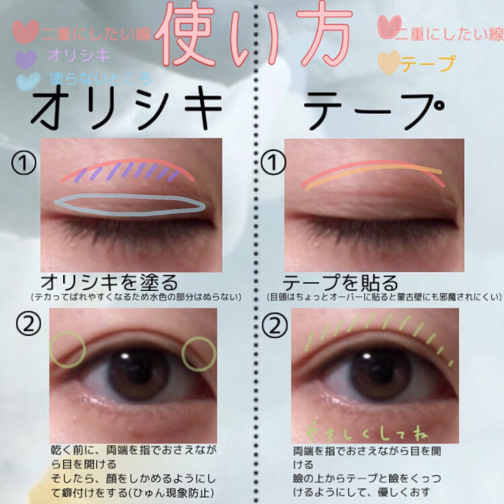私は、全く二重癖がついてない時はテープ、 うっすら癖がついてきたらオリシキに変えて二重の癖付けをしていましたっ! また、癖付けの他にもマッサージをすると蒙古壁解消、浮腫み解消、瞼が薄くなるなどの効果があり二重癖がつきやすくなります ⸜👍🏻⸝ アイプチやマッサージをしても瞼が伸びてしまうということはありませんので、 詳しいアイプチの仕方やマッサージ方法などにおきましては画像をご覧になってください⸜( ⍢ )⸝