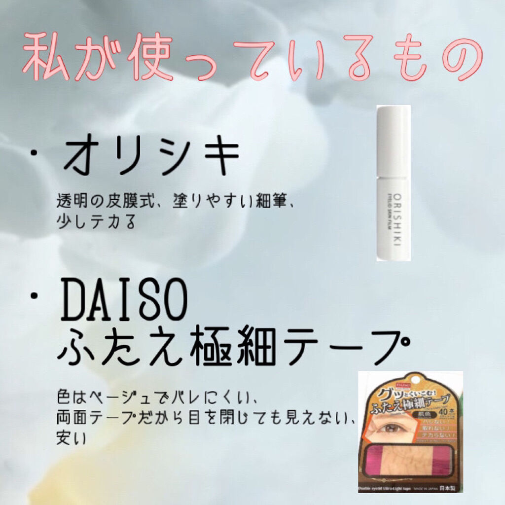 ✾私の二重成長記✾【私が使ったもの】①D-UPオリシキアイリッドスキンフィルム②DAISOグッとくいこむ!ふたえ極細テープ私は、全く二重癖がついてない時はテープ、うっすら癖がついてきたらオリシキに変えて二重の癖付けをしていましたっ!また、癖付...
