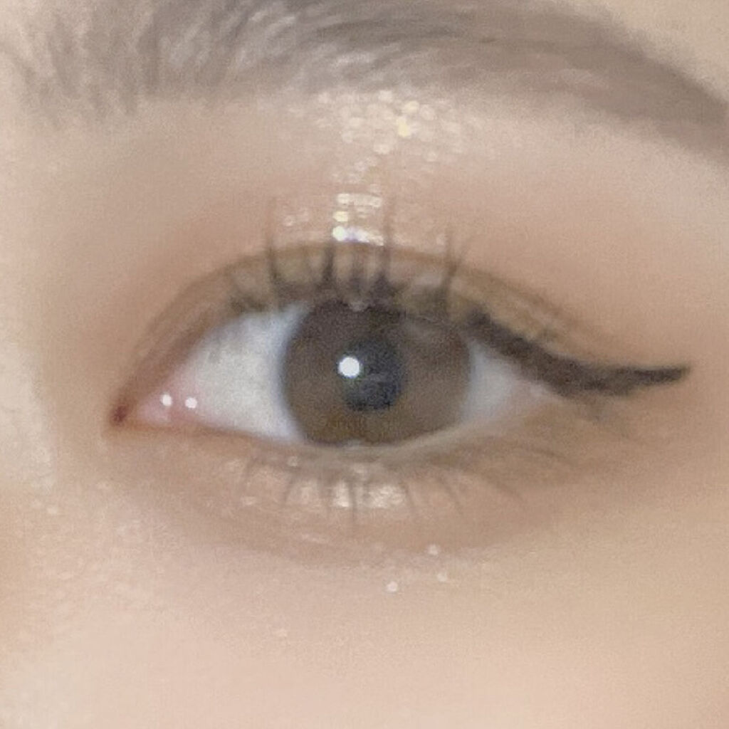 カラコン自体の大きさはそこまで大きくないので、自然にナチュラルに盛れます。 フチはなくて裸眼風なので、裸眼がトーンアップしつつ、少しだけハーフ系になりつつな色味です😻 この色は、どんな髪色にも似合う! 目の明るさが上がり、ちゅるんとしてて透明感爆上がりです🛁♡