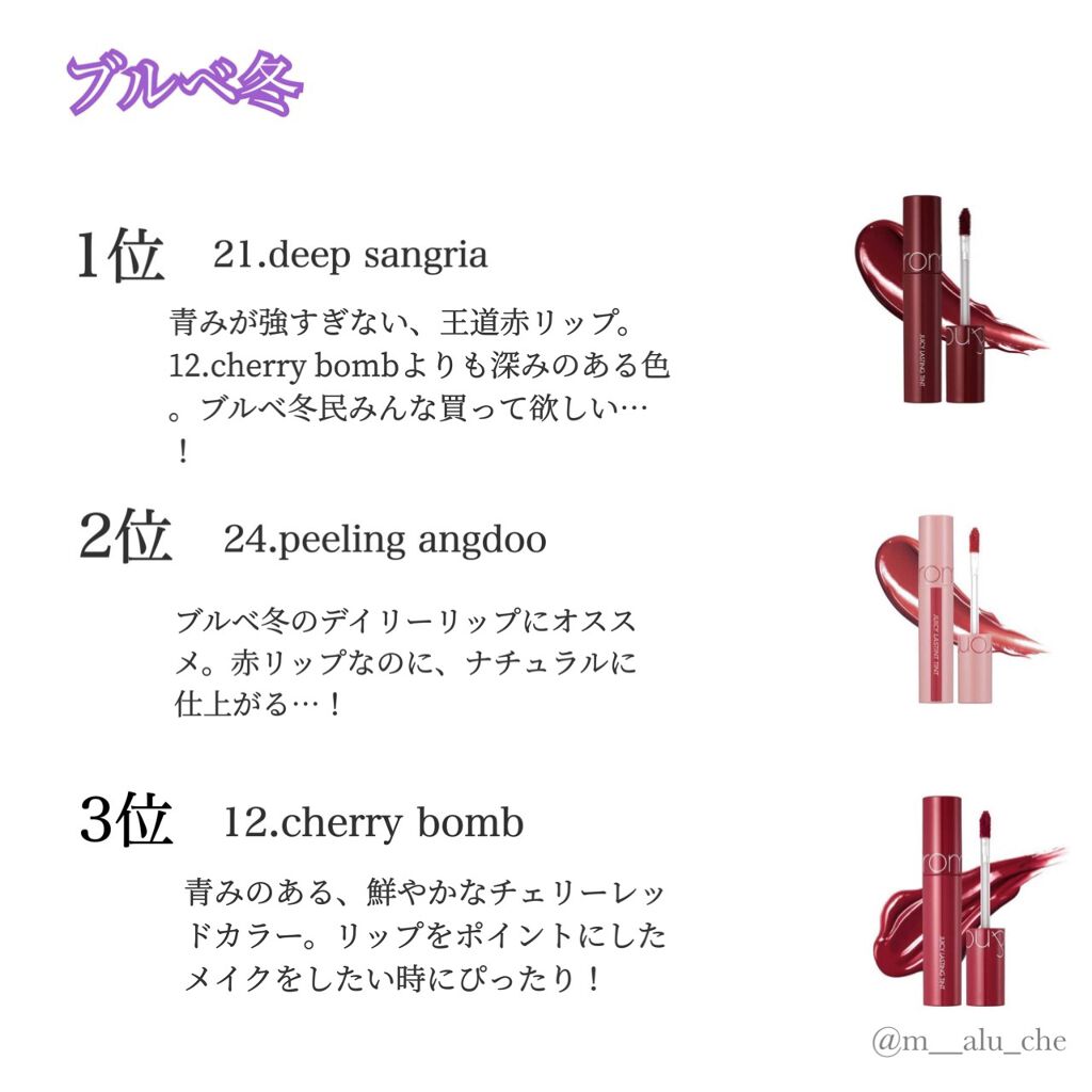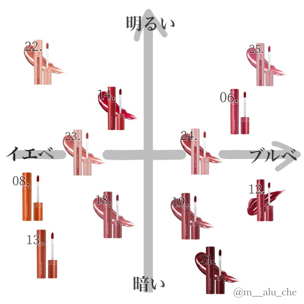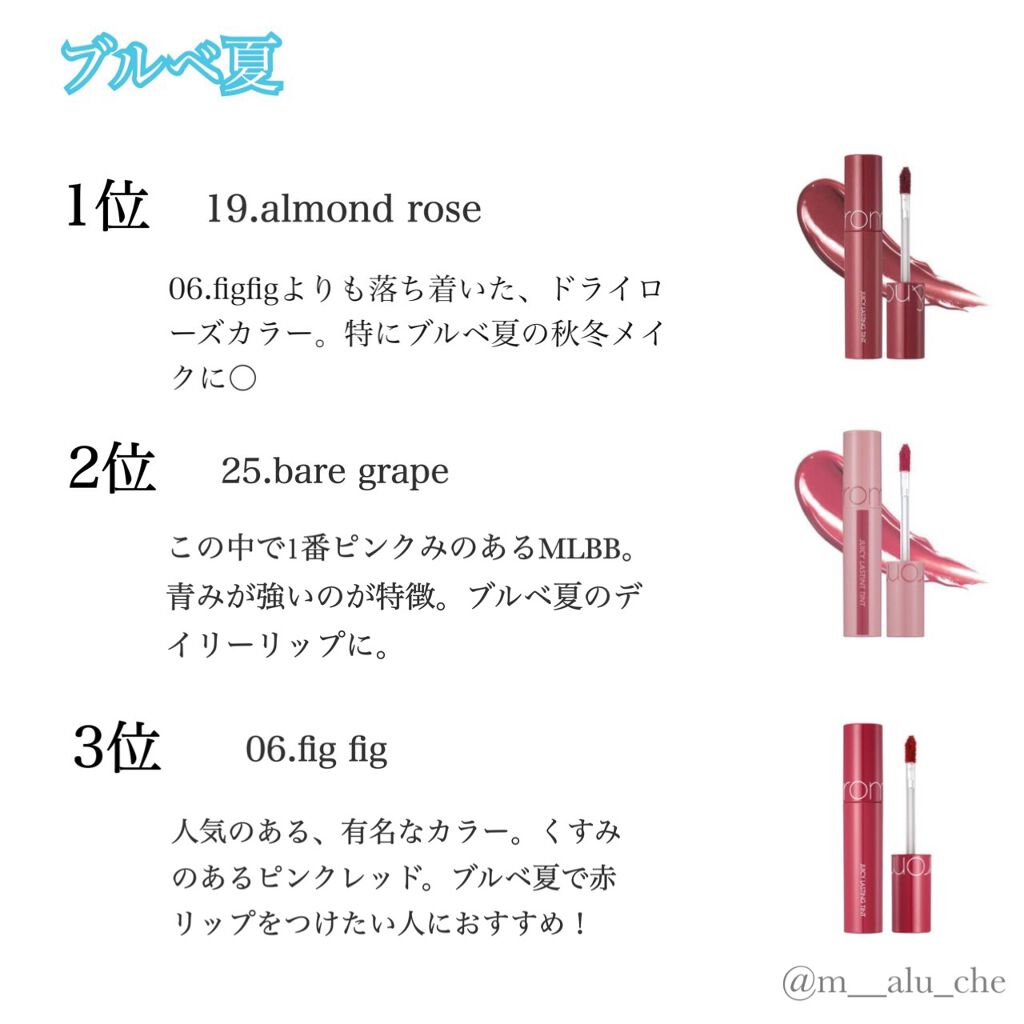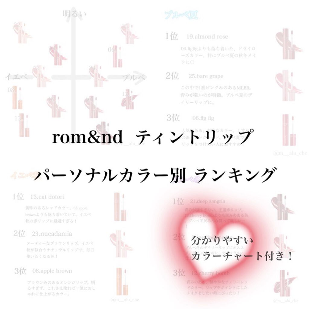今回は、ロムアンドのジューシーラスティングティントのおすすめをカラーチャート付きでまとめました!クリオのアイシャドウパレットに引き続き、図表があると分かりやすいかなあと思い、作りました❣️4タイプのパーソナルカラー別で、おすすめランキングを紹...