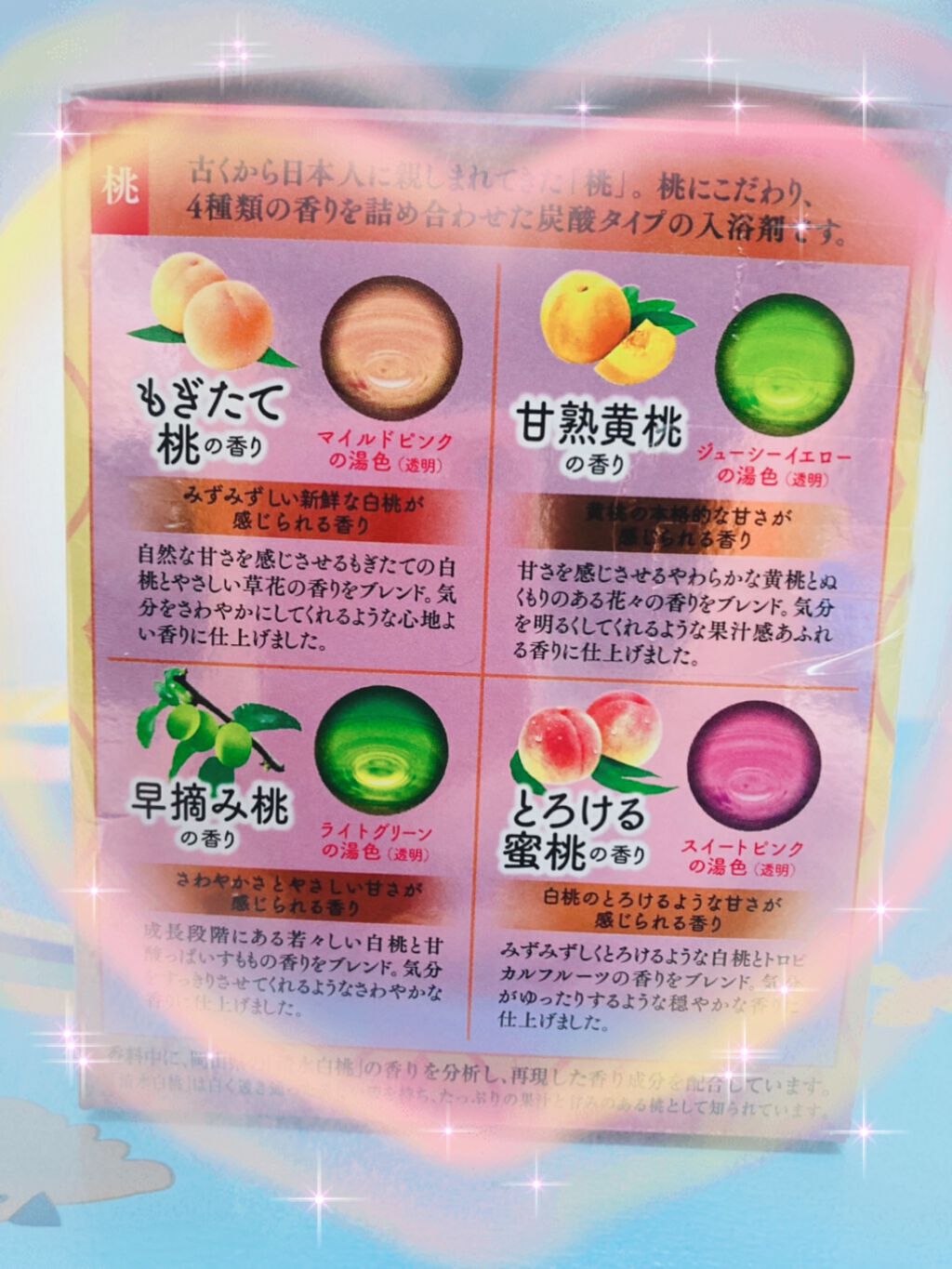 温泡炭酸湯こだわり桃ドラッグストアで購入しました!果物の香りが好きで、桃の香りがとっても好きなので、気になって購入してみました!20個入りで、800円台で買えたので、コスパもとっても良いと思います!4種類入っていて、甘い桃の香りから、甘酸っぱ...