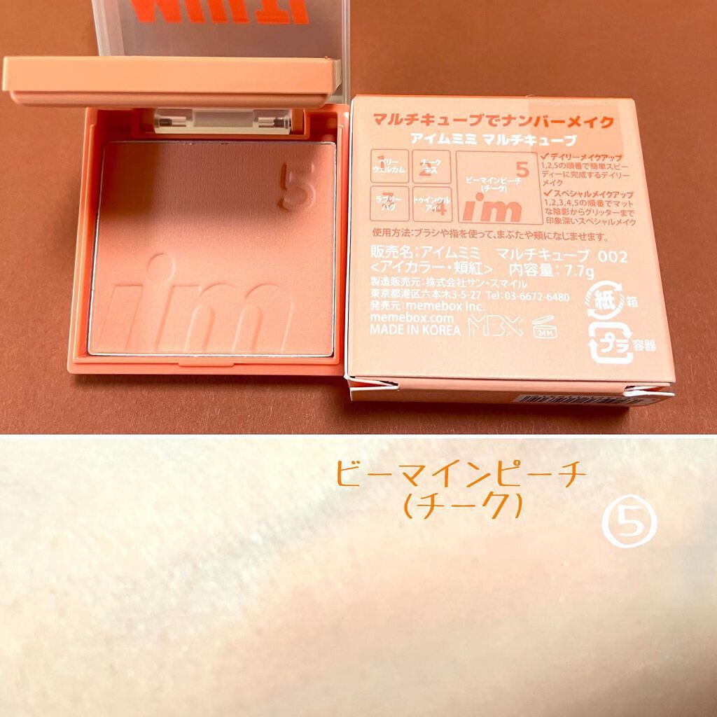 【I'MMEMEマルチキューブ002ハローピーチ】アイシャドウとチークがセットになっていて4.5×4.5×2cmのコンパクトサイズ❗️可愛くて小さめバッグにもすっぽりと収まります😌💕各カラーには番号が記載されており、順番通りに塗ることで綺麗に...