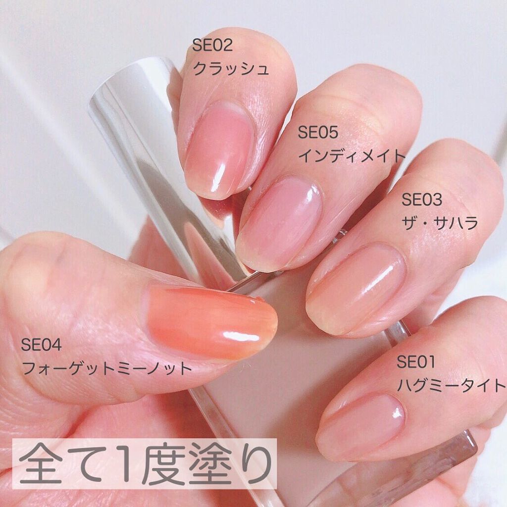 - <SE01.ハグミータイト> 酢酸ブチル、酢酸エチル、ニトロセルロース、アジピン酸/ネオペンチルグリコール/無水トリメリト酸コポリマー、クエン酸アセチルトリブチル、イソプロピルアルコ―ル、アクリル酸エステル共重合体、スチレン/アクリル酸エステル共重合体、イソ酪酸酢酸スクロース、ステアラルコニウムベントナイト、ジメチルシリル化シリカ、ジ安息香酸DPG、オクトクリレン、二酸化チタン、ポリビニルブチラール、黒酸化鉄、クエン酸、ジメチコン、赤201号、ブチルアルコール、ステアラルコニウムヘクトライト、トリメチルシロキシケイ酸 <SE02.クラッシュ> 酢酸ブチル、酢酸エチル、ニトロセルロース、アジピン酸/ネオペンチルグリコール/無水トリメリト酸コポリマー、クエン酸アセチルトリブチル、イソプロピルアルコ―ル、アクリル酸エステル共重合体、スチレン/アクリル酸エステル共重合体、イソ酪酸酢酸スクロース、ステアラルコニウムベントナイト、ジメチルシリル化シリカ、ジ安息香酸DPG、オクトクリレン、二酸化チタン、ポリビニルブチラール、黒酸化鉄、クエン酸、ジメチコン、赤201号、ブチルアルコール、ステアラルコニウムヘクトライト、トリメチルシロキシケイ酸 <SE03.ザ サハラ> 酢酸ブチル、酢酸エチル、ニトロセルロース、(アジピン酸/ネオペンチルグリコール/無水トリメリト酸)コポリマー、クエン酸アセチルトリブチル、イソプロパノール、アクリレーツコポリマー、(スチレン/アクリレーツ)コポリマー、イソ酪酸酢酸スクロース、ステアラルコニウムベントナイト、ジメチルシリル化シリカ、ジ安息香酸DPG、オクトクリレン、酸化チタン、ポリビニルブチラール、黒酸化鉄、黄4、クエン酸、ジメチコン、赤201、ブタノール、ステアラルコニウムヘクトライト、トリメチルシロキシケイ酸 <SE05.インティメイト> 酢酸ブチル、酢酸エチル、ニトロセルロース、アジピン酸/ネオペンチルグリコール/無水トリメリト酸コポリマー、クエン酸アセチルトリブチル、イソプロピルアルコ―ル、アクリル酸エステル共重合体、スチレン/アクリル酸エステル共重合体、イソ酪酸酢酸スクロース、ステアラルコニウムベントナイト、ジメチルシリル化シリカ、ジ安息香酸DPG、オクトクリレン、二酸化チタン、ポリビニルブチラール、黒酸化鉄、クエン酸、ジメチコン、赤201号、ブチルアルコール、ステアラルコニウムヘクトライト、トリメチルシロキシケイ酸 <SE06.レインウォッシュガーデン> 酢酸ブチル、酢酸エチル、ニトロセルロース、(アジピン酸/ネオペンチルグリコール/無水トリメリト酸)コポリマー、クエン酸アセチルトリブチル、イソプロパノール、(スチレン/アクリレーツ)コポリマー、アクリレーツコポリマー、イソ酪酸酢酸スクロース、ステアラルコニウムベントナイト、ジメチルシリル化シリカ、ジ安息香酸DPG、酸化チタン、オクトクリレン、黒酸化鉄、黄4、ポリビニルブチラール、クエン酸、ジメチコン、ステアラルコニウムヘクトライト、ブタノール、トリメチルシロキシケイ酸、コンジョウ <SE07.タッチオブスプリング> 酢酸ブチル、酢酸エチル、ニトロセルロース、(アジピン酸/ネオペンチルグリコール/無水トリメリト酸)コポリマー、クエン酸アセチルトリブチル、イソプロパノール、アクリレーツコポリマー、(スチレン/アクリレーツ)コポリマー、イソ酪酸酢酸スクロース、ステアラルコニウムベントナイト、ジ安息香酸DPG、ジメチルシリル化シリカ、オクトクリレン、ポリビニルブチラール、クエン酸、酸化チタン、黄4、ジメチコン、ブタノール、黒酸化鉄、トリメチルシロキシケイ酸、赤202、ステアラルコニウムヘクトライト <SE08.ヒントオブバイオレッド> 酢酸ブチル、酢酸エチル、ニトロセルロース、(アジピン酸/ネオペンチルグリコール/無水トリメリト酸)コポリマー、クエン酸アセチルトリブチル、イソプロパノール、アクリレーツコポリマー、(スチレン/アクリレーツ)コポリマー、イソ酪酸酢酸スクロース、ステアラルコニウムベントナイト、ジメチルシリル化シリカ、ジ安息香酸DPG、オクトクリレン、酸化チタン、ポリビニルブチラール、クエン酸、黒酸化鉄、黄4、ジメチコン、赤201、ブタノール、トリメチルシロキシケイ酸、コンジョウ、ステアラルコニウムヘクトライト <SE09.スプリングフィールドチューリップ> 酢酸ブチル、酢酸エチル、ステアラルコニウムベントナイト、ニトロセルロース、(アジピン酸/ネオペンチルグリコール/無水トリメリト酸)コポリマー、クエン酸アセチルトリブチル、イソプロパノール、アクリレーツコポリマー、(スチレン/アクリレーツ)コポリマー、イソ酪酸酢酸スクロース、ジメチルシリル化シリカ、ジ安息香酸DPG、酸化チタン、オクトクリレン、ポリビニルブチラール、クエン酸、黄4、赤202、ジメチコン、ブタノール、トリメチルシロキシケイ酸、カーボンブラック <SE04. FORGET ME NOT> 酢酸ブチル、酢酸エチル、ニトロセルロース