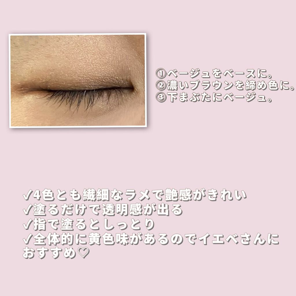 ふんわり、しっとり質感がたまんない🤤 指で塗るとその質感がわかります。 1度塗りでふんわり色づくけど、しっかり発色。2度塗りと変わりない まぶたに塗るとオレンジベージュがすっごく可愛い。まさに完熟🍑感♥(ナツメグだけど笑) ほんのりパールだから上品な目元に だからデートメイクにもおすすめ(*¨*)♡