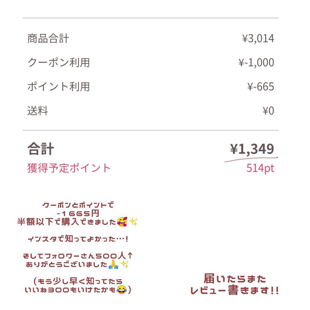 ã€ã³ã¹ã¿ã§ããŸããŸãLIPSã§1ææ«ãŸã§ïŒïŒïŒïŒåãªãã®ã¯ãŒãã³ãããããšç¥ã£ãç§ã¯æ©éã€ã³ã¹ããŒã«ããããã·ã§ã³ãå§ããŸããã ããã·ã§ã³ã§ãã€ã³ãã665ptãŸã§è²¯ãã(ããããã³ã¡ã³ãããã©ããŒããŠãã ãã£ãæ¹ããããšãããããŸãð€)ã¯ãŒãã³ãšåãããŠäœ¿ããŸããïŒ åèš4ç¹è³Œå ¥ããŸããïŒ(åçåç §) ååã3014åã ã£ãã®ã§å·®ãåŒããš1349åã§ãåé¡ã§è³Œå ¥ã§ããŸããâš