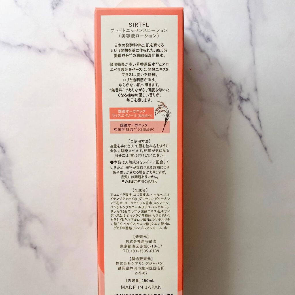 SIRTFLブライトエッセンスローションの紹介です潤いが長続き、素肌を健やかに整える”美肌サプリ”と言われるブライトエッセンスローションは肌を健やかに育む3種の発酵エキス配合酵母や麹で発酵させた発酵エキスが肌のバリア機能を守り、トラブルの起き...