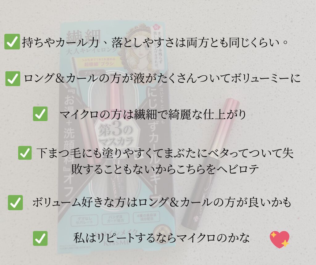 見た目的にもマイクロマスカラの方がスリムだけど内容量は3/4で同料金なんですね😳 💟両方とも滲んでパンダ目にならないのにオフは簡単。 💟夕方までカールが残ってる。 プチプラなのにこのクオリティは本当に素晴らしい😍 塗りやすさは、マイクロマスカラに軍配!下まつ毛も綺麗に塗れるし、ダマにならず繊細できれいなまつ毛になります。 ロング&カールの方は、特に最初の使い始めはドバっと出るので結構しごいて量を調整しても結構多くてダマになりやすいイメージがあります。 ロング&カールのストックが残っていて何とか使い切りたいなと思ってwマイクロマスカラのブラシをロング&カールの容器に突っ込んで使ってみたことがあります😂😂 値段は割高になっちゃいますが、リピするならマイクロマスカラの方かなと