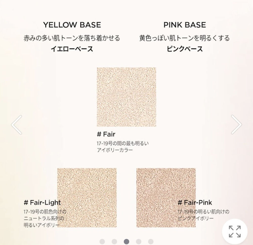 - <Fair(本体+リフィル)> 水、シクロペンタシロキサン、酸化チタン、メトキシケイヒ酸エチルヘキシル、トリメチルシロキシケイ酸、サリチル酸エチルヘキシル、グリセリン、PEG-10ジメチコン、BG、エチルヘキサン酸セチル、ナイアシンアミド、ペンチレングリコール、合成フルオロフロゴパイト、カプリリルメチコン、ポリプロピルシルセスキオキサン、(ビニルピロリドン/ヘキサデセン)コポリマー、酸化鉄、硫酸Mg、フェノキシエタノール、セチルPEG/PPG-10/1ジメチコン、ジステアルジモニウムヘクトライト、ステアリン酸、アルミナ、(アクリレーツ/ジメチコン)コポリマー、水酸化Al、トリエトキシカプリリルシラン、ジメチコン、香料、エチルヘキシルグリセリン、ジメチコンクロスポリマー、アデノシン、EDTA-2Na、(ジメチコン/ビニルジメチコン)クロスポリマー、マイカ、酸化スズ、ポリグルタミン酸 <Fair Light(本体+リフィル)> 水、シクロペンタシロキサン、酸化チタン、メトキシケイヒ酸エチルヘキシル、トリメチルシロキシケイ酸、サリチル酸エチルヘキシル、グリセリン、PEG-10ジメチコン、BG、エチルヘキサン酸セチル、ナイアシンアミド、ペンチレングリコール、合成フルオロフロゴパイト、カプリリルメチコン、ポリプロピルシルセスキオキサン、(ビニルピロリドン/ヘキサデセン)コポリマー、酸化鉄、硫酸Mg、フェノキシエタノール、セチルPEG/PPG-10/1ジメチコン、ジステアルジモニウムヘクトライト、ステアリン酸、アルミナ、(アクリレーツ/ジメチコン)コポリマー、水酸化Al、トリエトキシカプリリルシラン、ジメチコン、香料、エチルヘキシルグリセリン、ジメチコンクロスポリマー、アデノシン、EDTA-2Na、(ジメチコン/ビニルジメチコン)クロスポリマー、マイカ、酸化スズ、ポリグルタミン酸 <Fair pink(本体+リフィル)> 水、シクロペンタシロキサン、酸化チタン、メトキシケイヒ酸エチルヘキシル、トリメチルシロキシケイ酸、サリチル酸エチルヘキシル、グリセリン、PEG-10ジメチコン、BG、エチルヘキサン酸セチル、ナイアシンアミド、ペンチレングリコール、合成フルオロフロゴパイト、カプリリルメチコン、ポリプロピルシルセスキオキサン、(ビニルピロリドン/ヘキサデセン)コポリマー、酸化鉄、硫酸Mg、フェノキシエタノール、セチルPEG/PPG-10/1ジメチコン、ジステアルジモニウムヘクトライト、ステアリン酸、アルミナ、(アクリレーツ/ジメチコン)コポリマー、水酸化Al、トリエトキシカプリリルシラン、ジメチコン、香料、エチルヘキシルグリセリン、ジメチコンクロスポリマー、アデノシン、EDTA-2Na、(ジメチコン/ビニルジメチコン)クロスポリマー、マイカ、酸化スズ、ポリグルタミン酸 <pink Light(本体+リフィル)> 水、シクロペンタシロキサン、酸化チタン、メトキシケイヒ酸エチルヘキシル、トリメチルシロキシケイ酸、サリチル酸エチルヘキシル、グリセリン、PEG-10ジメチコン、BG、エチルヘキサン酸セチル、ナイアシンアミド、ペンチレングリコール、合成フルオロフロゴパイト、カプリリルメチコン、ポリプロピルシルセスキオキサン、(ビニルピロリドン/ヘキサデセン)コポリマー、酸化鉄、硫酸Mg、フェノキシエタノール、セチルPEG/PPG-10/1ジメチコン、ジステアルジモニウムヘクトライト、ステアリン酸、アルミナ、(アクリレーツ/ジメチコン)コポリマー、水酸化Al、トリエトキシカプリリルシラン、ジメチコン、香料、エチルヘキシルグリセリン、ジメチコンクロスポリマー、アデノシン、EDTA-2Na、(ジメチコン/ビニルジメチコン)クロスポリマー、マイカ、酸化スズ、ポリグルタミン酸 <Light(本体+リフィル)> 水、シクロペンタシロキサン、酸化チタン、メトキシケイヒ酸エチルヘキシル、トリメチルシロキシケイ酸、サリチル酸エチルヘキシル、グリセリン、PEG-10ジメチコン、BG、エチルヘキサン酸セチル、ナイアシンアミド、ペンチレングリコール、合成フルオロフロゴパイト、カプリリルメチコン、ポリプロピルシルセスキオキサン、(ビニルピロリドン/ヘキサデセン)コポリマー、酸化鉄、硫酸Mg、フェノキシエタノール、セチルPEG/PPG-10/1ジメチコン、ジステアルジモニウムヘクトライト、ステアリン酸、アルミナ、(アクリレーツ/ジメチコン)コポリマー、水酸化Al、トリエトキシカプリリルシラン、ジメチコン、香料、エチルヘキシルグリセリン、ジメチコンクロスポリマー、アデノシン、EDTA-2Na、(ジメチコン/ビニルジメチコン)クロスポリマー、マイカ、酸化スズ、ポリグルタミン酸 <Medium(本体+リフィル)> 水、シクロペンタシロキサン、酸化チタン、メトキシケイヒ酸エチルヘキシル、トリメチルシロキシケイ酸、サリチル酸エチルヘキシル、グリセリン、PEG-10ジメチコン、BG、エチルヘキサン酸セチル、ナイアシンアミド、ペンチレングリコール、合成フルオロフロゴパイト、カプリリルメチコン、ポリプロピルシルセスキオキサン、(ビニルピロリドン/ヘキサデセン)コポリマー、酸化鉄、硫酸Mg
