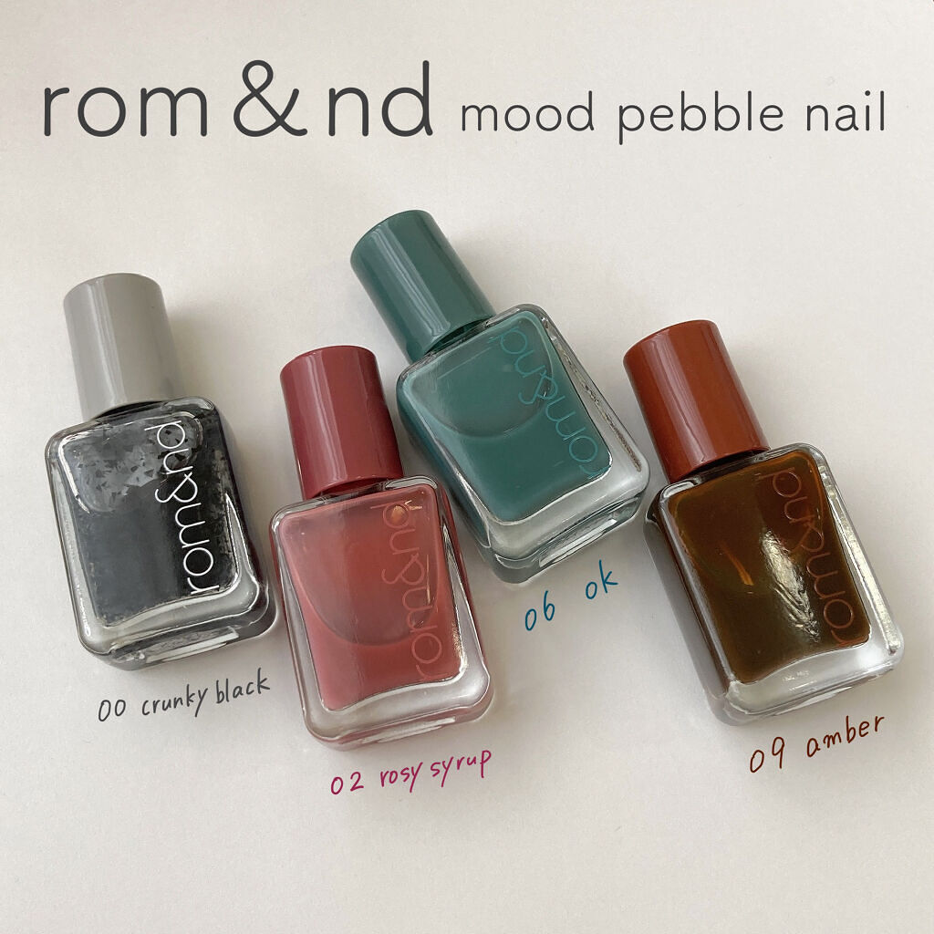 - 指先に玉石のような、ならかな光沢をとどめる。塗った瞬間から綺麗なツヤと光沢を維持し、重ねて塗っても透き通ったカラー感を鮮やかにとどめる、素早い乾燥力のナチュラルカラーネイル。「ロムアンド」の次世代型ネイルです。