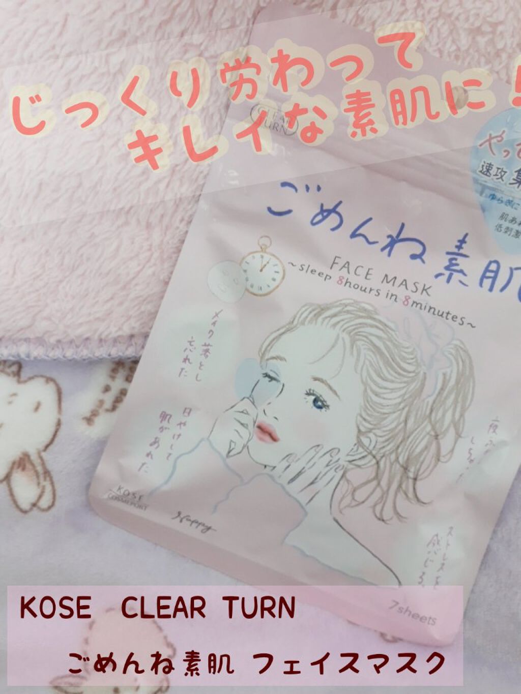 - 【クリアターン ごめんね素肌マスク】 負担をかけて、あれてしまった肌の素肌環境※1をととのえる“速攻集中リペア※2マスク”です。 ① あれがちな肌を素早くコンディションケア! ザクロエキス、桜エキス※3、ウメ果実エキスBG配合し、ゆらぎやすい肌環境をととのえ、肌あれをケアします。また、うるおいケア成分として、ヒアルロン酸、白キクラゲ多糖体BGを配合。外的ストレス※4や不規則な生活の影響を受けやすい肌も健やかでゆらぎにくい肌へみちびきます。 ②敏感肌も使える、弱酸性・低刺激処方 無香料・無着色・無鉱物油・アルコールフリー(エチルアルコール)・パラベンフリー・紫外線吸収剤フリー・シリコーンフリー・パッチテスト済み・アレルギーテスト済み・スティンギングテスト済み・敏感肌自覚者による連用テスト済み(すべての方にアレルギーや皮膚刺激が起きない、刺激感がないというわけではありません。すべての方の肌に合うということではありません。) ③角質ケアもできる!凸凹高密着シート コットン生まれのやわらかな肌触りのベンリーゼを使用。 表面に凸凹のエンボス加工を施しているため、密着性が高く、はがしたマスクでやさしく顔をふきとることで角質ケアもできます。 ※1 うるおい環境のこと ※2 うるおいお手入れのこと ※3 ソメイヨシノ葉エキス、ウメ果実エキスBGはウメ果実エキス・BG(保湿) ※4 乾燥による刺激のこと