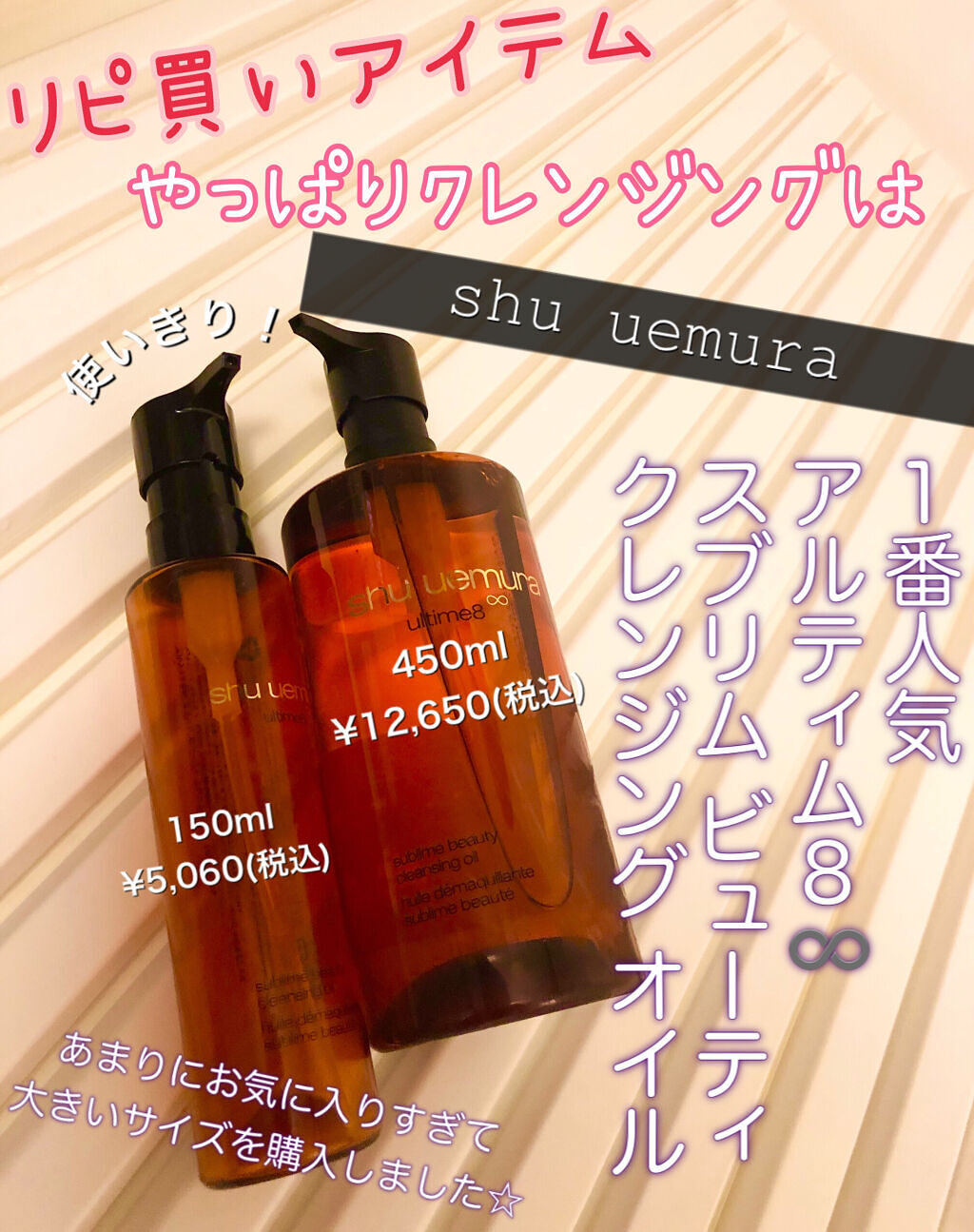 shuuemuraアルティム8∞スブリムビューティクレンジングオイルn450ml¥6,270マツエクOK、濡れた肌OKクレンジングオイルの中でいちばん好きかもー黒色の毛穴に特化した商品も使ってみたい✨...
