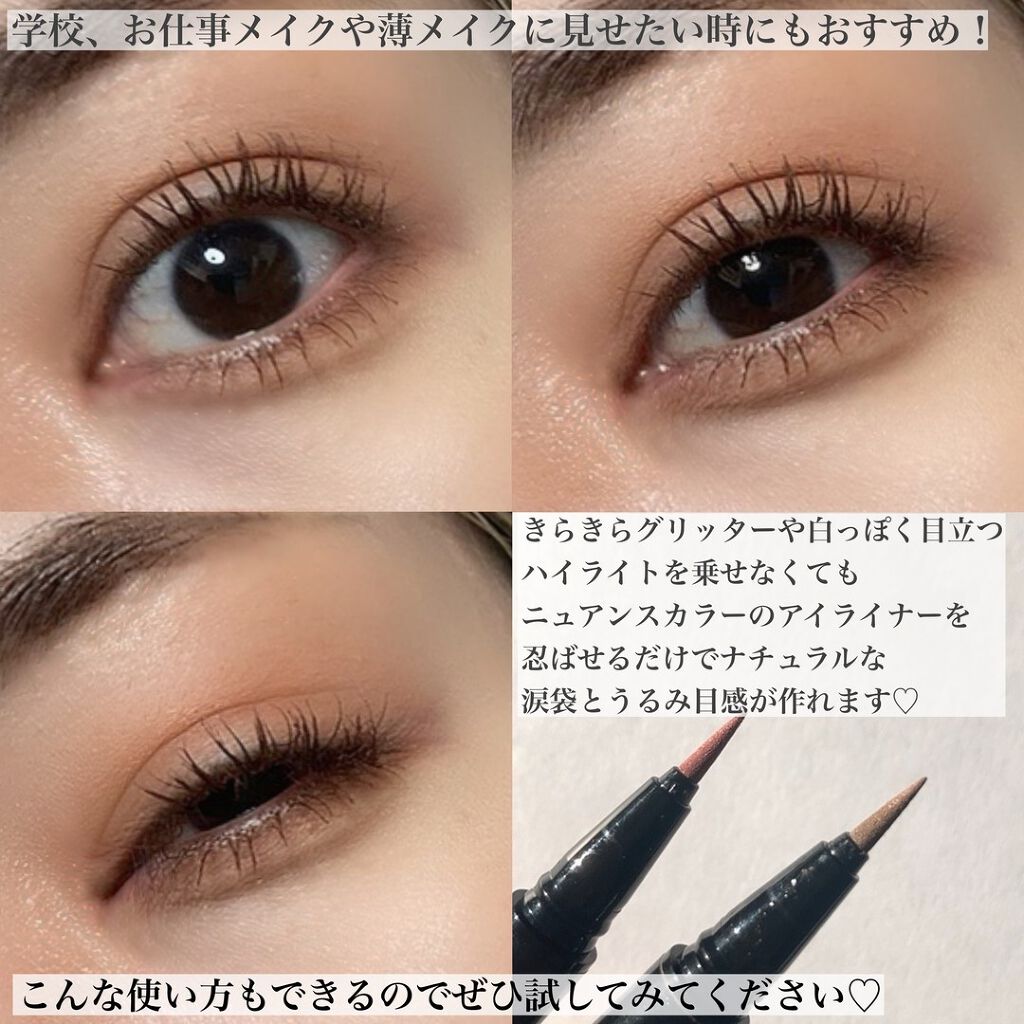 - ブラウンシャドウを引き立てる カラーライナー。スモーキーやヌーディーなど、ブラウンの魅力を引き出すカラー展開。 落ちにくくにじみにくいフィルムタイプ。液含みが良くしなやかなフェルトチップ筆採用。