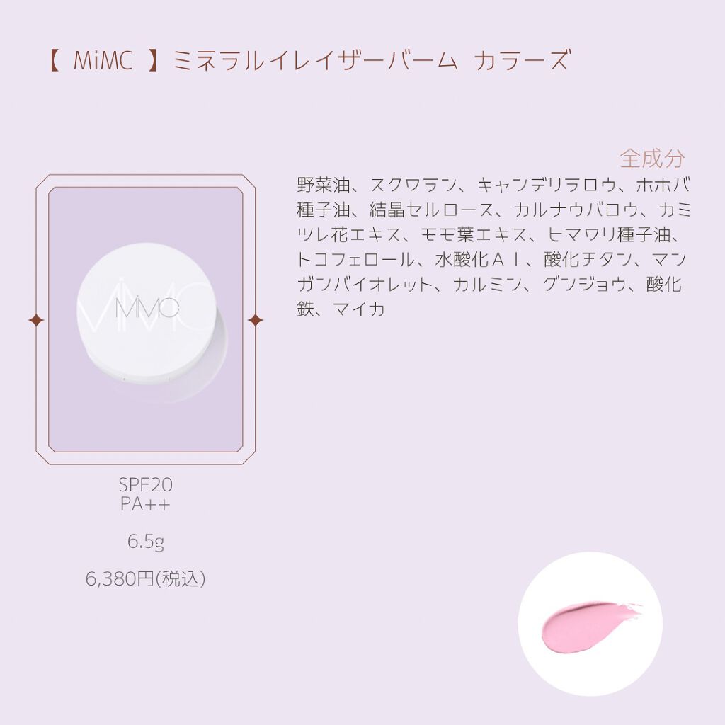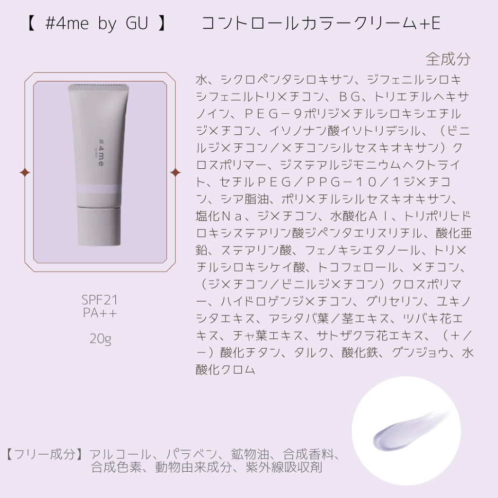 WHOMEEは1年以上愛用していますが、少量ずつ出せる形状の口なので、意外とコスパが良いです。ピンク過ぎず、青過ぎず、丁度良い紫色で気に入ってます。 【FANCL】スキンケアベース エクセレントリッチhttps://www.fancl.co.jp/beauty/item/3202-11 【無印良品】UVベースコントロールカラー・パープルhttps://www.muji.com/jp/ja/store/cmdty/detail/4550002545840 【ONLY MINERAL】ミネラルプラスベースhttps://www.onlyminerals.jp/products/base-makeup/mineral-plus-base.html 【ナチュラグラッセ】 カラーコントロール ベースバイオレットhttps://www.naturesway.jp/products/detail/18001000 【Borica】くずれ防止 美容液ケアベースミルクパープル(【数量限定】SERUM MAKE UP BASE SERIES 21SS)https://borica.jp/item/carebase-milkpurple 【#4me by GU】コントロールカラークリーム+Ehttps://www.gu-global.com/jp/ja/products/E331207-000/00 【m.m.m】ムー カラーチューナーhttps://mmm-cosmetics.com/products/240000000 【MiMC】ミネラルイレイザーバーム カラーズhttps://www.mimc.co.jp/shop/g/geraserbalm-colorsset/