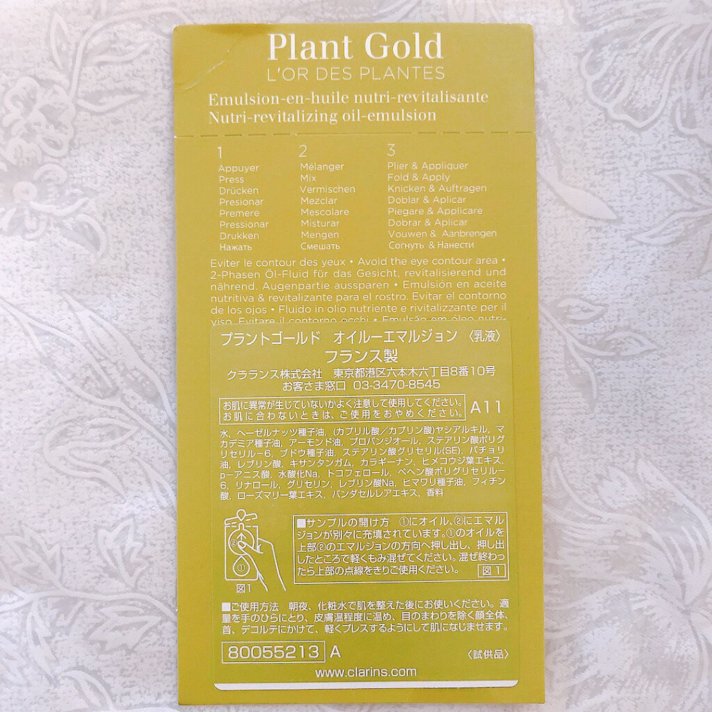 \サンプル品レビュー/サンプル品ってお泊りの時に使ったりする事が多いんだけどコロナ禍で全くお泊りする機会が無くなり〜貯まってきたので消費中〜♬CLARINS(クラランス)プラントゴールドオイルーエマルジョンこちらは二相式の乳液なんです❣手のひ...