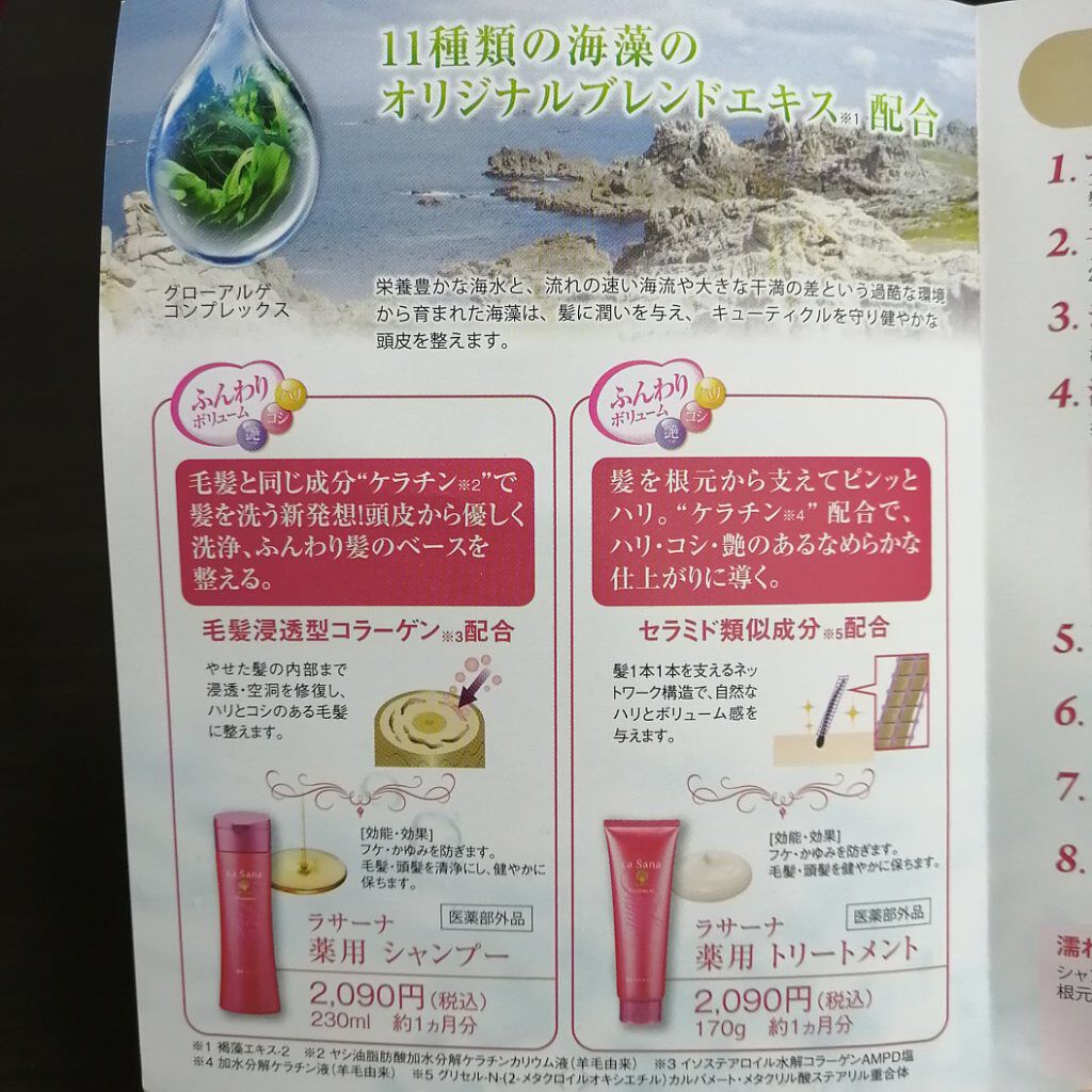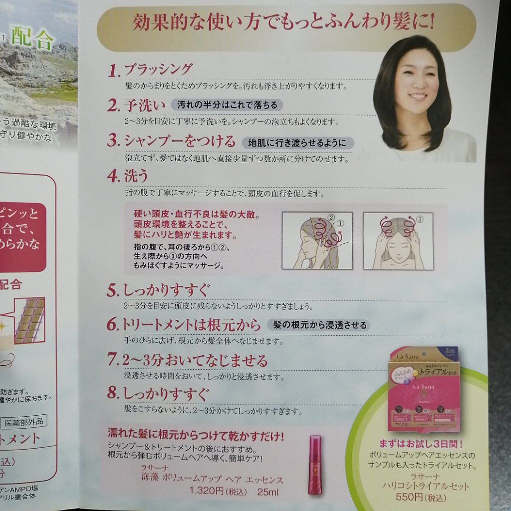 【使った商品】 〇ラサーナ薬用シャンプー 〇ラサーナ薬用トリートメント 〇ラサーナ海藻ボリュームアップヘアエッセンス <ヘアトリートメント>〜洗い流さないタイプ〜 ※ドラッグストアでサプリメントを買ったところ、 サンプル・テスターとしてい...