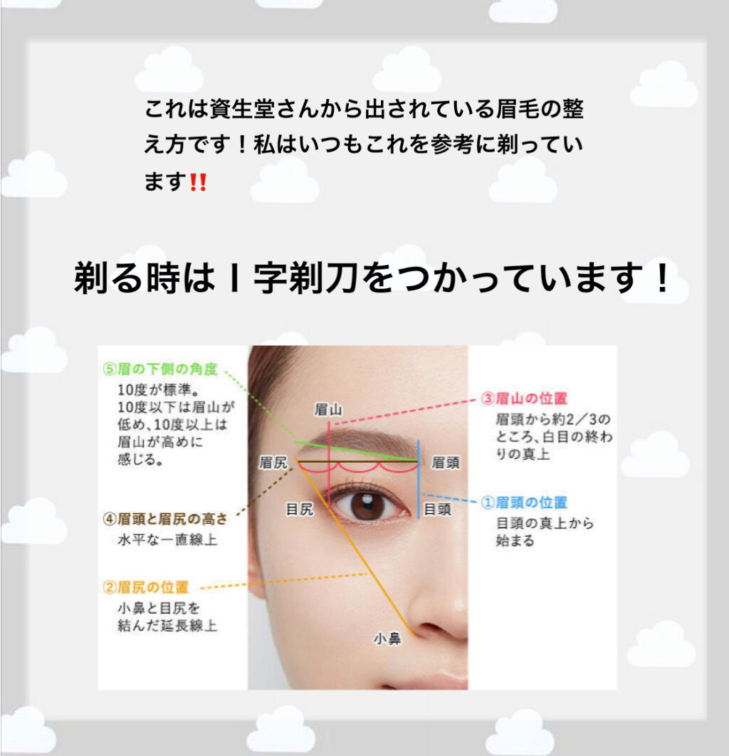 眉周りの産毛を剃る。 好みの眉毛の形に合わせて眉頭・眉山・眉尻の3つに点を書く。 線から2〜3㍉離れた所までシェーバーで剃る。 線に沿って慎重にシェーバーと毛抜きを使って剃る。 ブラシで眉毛を上の線まで持っていき、はみ出したものをハサミで切る。
