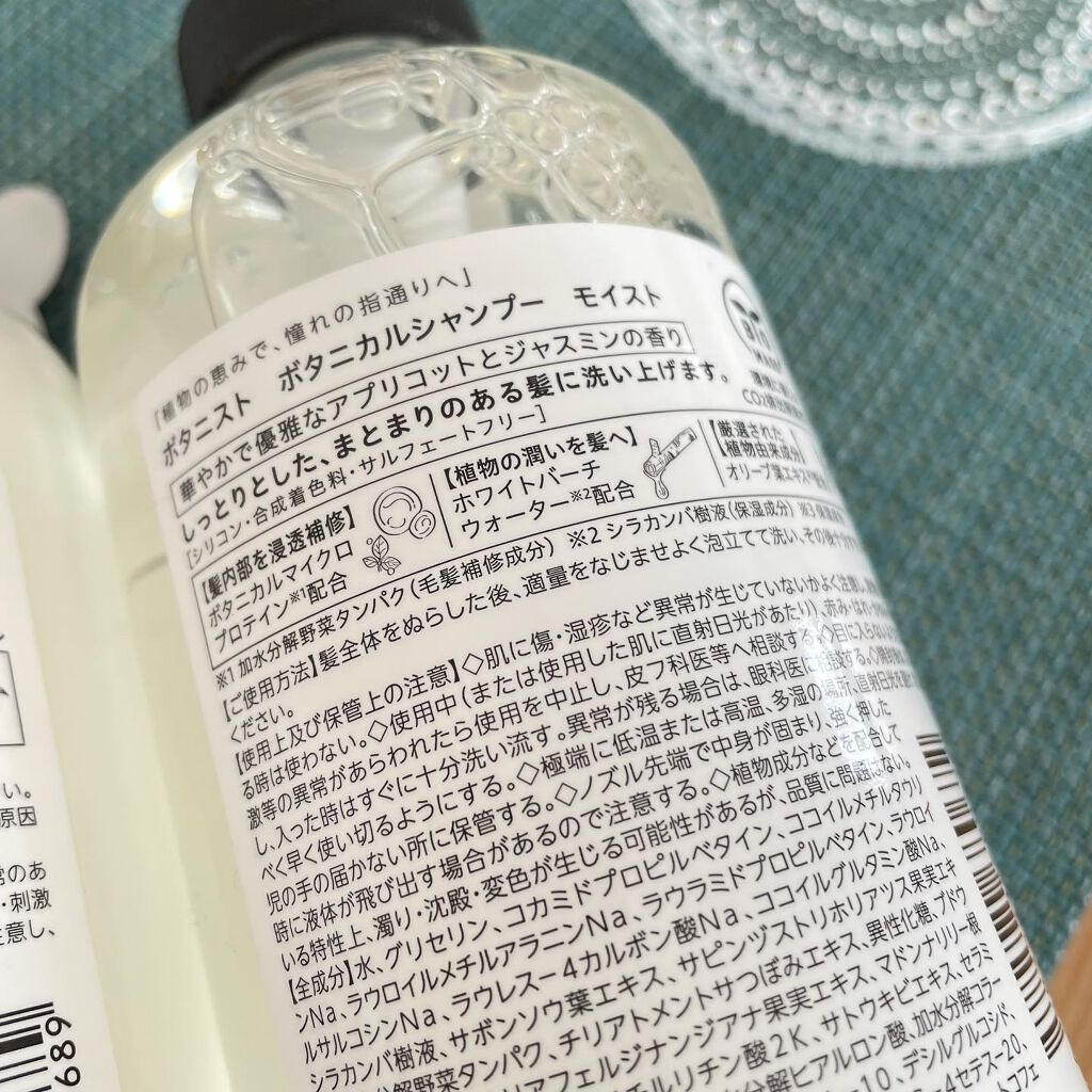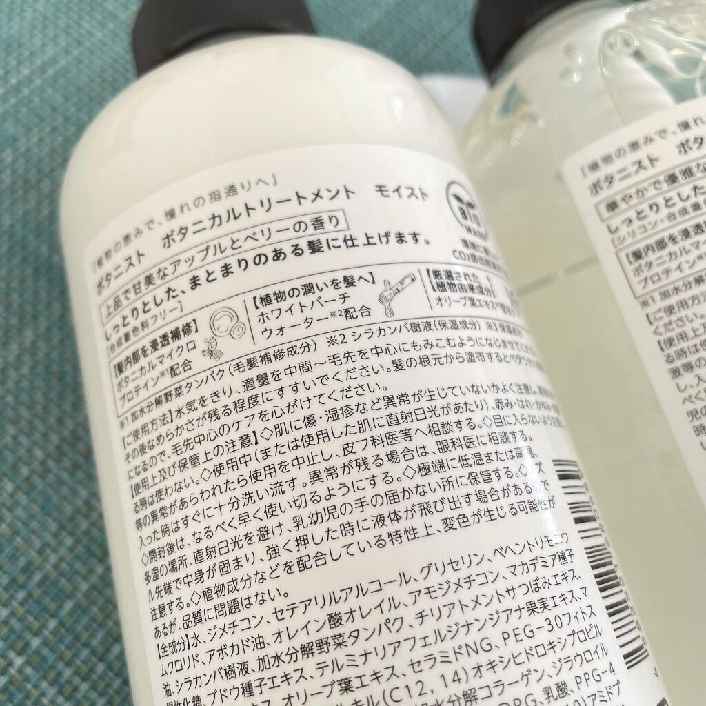 - リニューアル発売 しっとりまとまる髪へ シャンプー:アプリコットとジャスミンの香り トリートメント:アップルとベリーの香り BOTANISTらしい白と黒のロゴを生かし、よりクリーンでシンプルなデザイン 非常に細かい粒子の植物由来たんぱく質【ボタニカルマイクロプロテイン[*1]】を新配合し、今まで届かなかった髪の内部まで浸透しダメージを補修。なめらかでツヤやかな髪へと導きます。 *1加水分解野菜タンパク(毛髪補修成分) □こだわりの植物由来成分配合 □やさしい弱酸性のせっけん系成分を配合 □ダブルフレグランスを採用 □天然の洗浄剤とも言われるソープナッツ [*8]やサボンソウ [*9]を配合 □シリコンフリー(トリートメント:モイスト、スムース、ダメージケアを除く)、合成着色料フリー リニューアルで更にフリー項目追加:パラベンフリー、サルフェートフリー(シャンプーのみ)