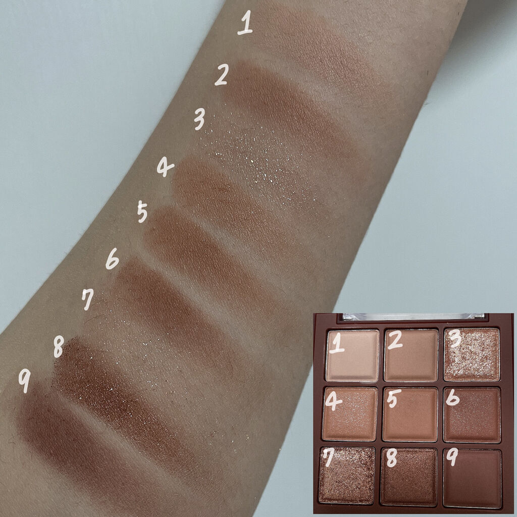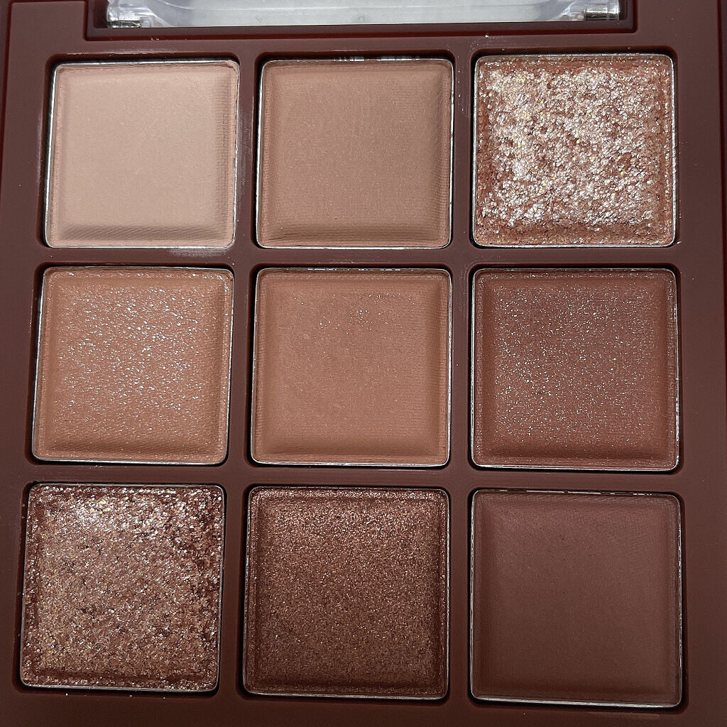 奥ゆかしいチョコレートブラウンムードを詰め込んだアイシャドウパレット🧸 色味はもちろん、アイシャドウが立体的になっていて、本物のチョコレートみたいな、見た目からして可愛い❣️ マットからラメ、グリッターまでバリエーション豊富な9色で、思いのままにアイメイクができる万能パレット🐰