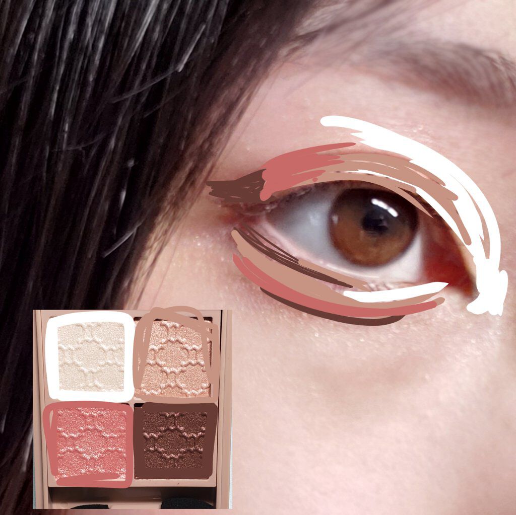 「キャンメイククリーミータッチライナー03ダークブラウン」 アイラインを描く。 「キャンメイクパーフェクトマルチアイズ07ウィークエンドオランジュ」 右上の白色を目元全体に塗る。この時アイラインをぼかす。 左下の赤色を涙袋、目尻にふんわり塗る。 右下の濃い茶色で涙袋の影を作る。 「MAJOLICA MAJORCAシャドーカスタマイズBR701花言葉」 涙袋と目頭、アイホールの中央に塗る。 「キャンメイククイックラッシュカーラー」 まつ毛を上げてから塗る。 「MAJOLICA MAJORCAラッシュエキスパンダー ロングロングロング EXOR505ヴィンテージオレンジ 歩幅」 毛先に塗る。
