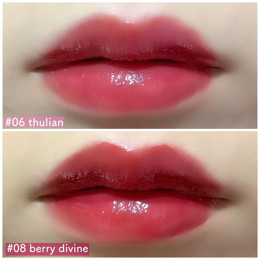 - <01 インコーラル> 水、ビスジグリセリルポリアシルアジペート-2、グリセリン、ジフェニルジメチコン、ジフェニルシロキシフェニルトリメチコン、ポリグリセリン-3、リンゴ酸ジイソステアリル、水添ポリイソブテン、ポリブテン、トリメチルシロキシフェニルジメチコン、変性アルコール、ポリソルベート60、イソノナン酸イソノニル、ペンチレングリコール、(アクリル酸ヒドロキシエチル/アクリロイルジメチルタウリンNa)コポ リマー、ラベンダーエキス、ハナハッカ花/葉/茎エキス、ローズマリーエキス、タイムエキス、ステアリン酸グリセリル、ステアリン酸PEG-100、スクワラン、ラウリルPEG-10トリス(トリメチルシロキシ)シリルエチルジメチコン、エチルヘキシルグリセリン、デキストリン、ステビオシド、イソステアリン酸ソルビタン、エチレンジアミンジコハク酸3Na、水酸化Al、ポリアクリル酸アンモニウム、BG、トコフェロール、フェノキシエタノール、香料、リモネン、酸化チタン、黄5、赤227、黄4、青1 <03 イフローズ> 水、ビスジグリセリルポリアシルアジペート-2、グリセリン、ジフェニルジメチコン、ジフェニルシロキシフェニルトリメチコン、ポリグリセリン-3、リンゴ酸ジイソステアリル、水添ポリイソブテン、ポリブテン、トリメチルシロキシフェニルジメチコン、変性アルコール、ポリソルベート60、イソノナン酸イソノニル、ペンチレングリコール、(アクリル酸ヒドロキシエチル/アクリロイルジメチルタウリンNa)コポリマー、ラベンダーエキス、ハナハッカ花/葉/茎エキス、ローズマリーエキス、タイムエキス、ステアリン酸グリセリル、ステアリン酸PEG-100、スクワラン、ラウリルPEG-10トリス(トリメチルシロキシ)シリルエチルジメチコン、エチルヘキシルグリセリン、デキストリン、ステビオシド、トリイソステアリン酸ポリグリセリル-2、イソステアリン酸ソルビタン、エチレンジアミンジコハク酸3Na、水酸化Al、ポリアクリル酸アンモニウム、BG、トコフェロール、フェノキシエタノール、香料、リモネン、酸化チタン、黄5、赤227、青1、黄4、赤218 <04 チリアップ> 水、ビスジグリセリルポリアシルアジペート-2、グリセリン、ジフェニルジメチコン、ジフェニルシロキシフェニルトリメチコン、ポリグリセリン-3、リンゴ酸ジイソステアリル、水添ポリイソブテン、ポリブテン、トリメチルシロキシフェニルジメチコン、変性アルコール、ポリソルベート60、イソノナン酸イソノニル、ペンチレングリコール、(アクリル酸ヒドロキシエチル/アクリロイルジメチルタウリンNa)コポ リマー、ラベンダーエキス、ハナハッカ花/葉/茎エキス、ローズマリーエキス、タイムエキス、ステアリン酸グリセリル、ステアリン酸PEG-100、スクワラン、ラウリルPEG-10トリス(トリメチルシロキシ)シリルエチルジメチコン、エチルヘキシルグリセリン、デキストリン、ステビオシド、イソステアリン酸ソルビタン、エチレンジアミンジコハク酸3Na、トコフェロール、BG、フェノキシエタノール、料、リモネン、黄5、赤227、黄4、青1 <06 チュリアン> 水、ビスジグリセリルポリアシルアジペート-2、グリセリン、ジフェニルジメチコン、ジフェニルシロキシフェニルトリメチコン、ポリグリセリン-3、リンゴ酸ジイソステアリル、水添ポリイソブテン、ポリブテン、トリメチルシロキシフェニルジメチコン、変性アルコール、ポリソルベート60、イソノナン酸イソノニル、ペンチレングリコール、(アクリル酸ヒドロキシエチル/アクリロイルジメチルタウリンNa)コポリマー、ラベンダーエキス、ハナハッカ花/葉/茎エキス、ローズマリーエキス、タイムエキス、ステアリン酸グリセリル、ステアリン酸PEG-100、スクワラン、ラウリルPEG-10トリス(トリメチルシロキシ)シリルエチルジメチコン、エチルヘキシルグリセリン、デキストリン、ステビオシド、イソステアリン酸ソルビタン、エチレンジアミンジコハク酸3Na、水酸化Al、ポリアクリル酸アンモニウム、BG、トコフェロール、フェノキシエタノール、香料、リモネン、酸化チタン、黄5、赤227、酸化鉄、黄4、赤218、青1 <08 ベリーディヴァイン> 水、ビスジグリセリルポリアシルアジペート-2、グリセリン、ジフェニルジメチコン、ジフェニルシロキシフェニルトリメチコン、ポリグリセリン-3、リンゴ酸ジイソステアリル、水添ポリイソブテン、ポリブテン、トリメチルシロキシフェニルジメチコン、変性アルコール、ポリソルベート60、イソノナン酸イソノニル、ペンチレングリコール、(アクリル酸ヒドロキシエチル/アクリロイルジメチルタウリンNa)コポリマー、ラベンダーエキス、ハナハッカ花/葉/茎エキス、ローズマリーエキス、タイムエキス、ステアリン酸グリセリル、ステアリン酸PEG-100、スクワラン、ラウリルPEG-10トリス(トリメチルシロキシ)シリルエチルジメチコン、エチルヘキシルグリセリン、イソステアリン酸ソルビタン、デキストリン、ステビオシド、エチレンジアミン